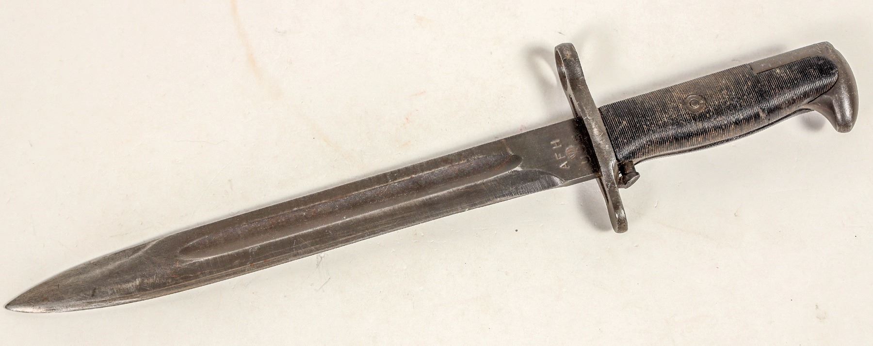 This is a bayonet made by American Fork and Hoe Co. marked "AFH/U flaming bomb S" on the ricasso without any dates. WW2 vintage. The bayonet is 14.25 in. overall length with a 9.75 in. blade. The blade has been lightly sharpened, with black bakelite grips. The release button is under the guard that likely pivots on the single mounting screw and levers open the catch. In very good condition without scabbard. The scales are in excellent condition without any nicks. Please see photo for details.