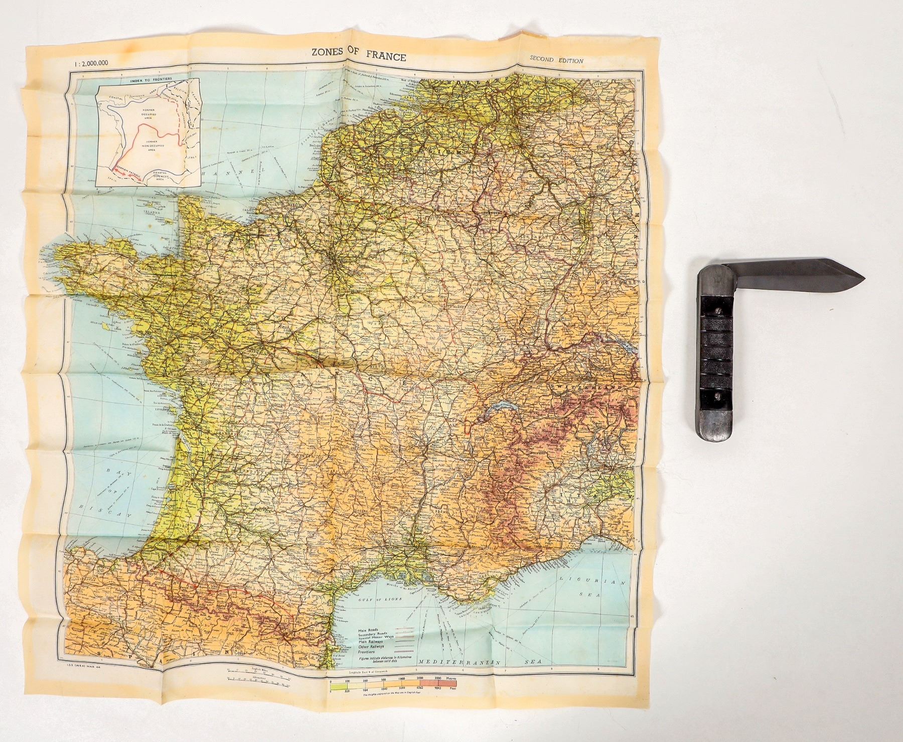 This is a massive folder knife issued to US Navy Pilots during WW2. This one is in like new condition with the factory grind on the edge along with the saw blade intact. The saw was likely for extraction from a plane fuselage. 6 in. closed, 10.5 in. open. No sheath provided. A silk pilot's map of France is included that indicates areas of occupation by German forces. Please see photo for details.