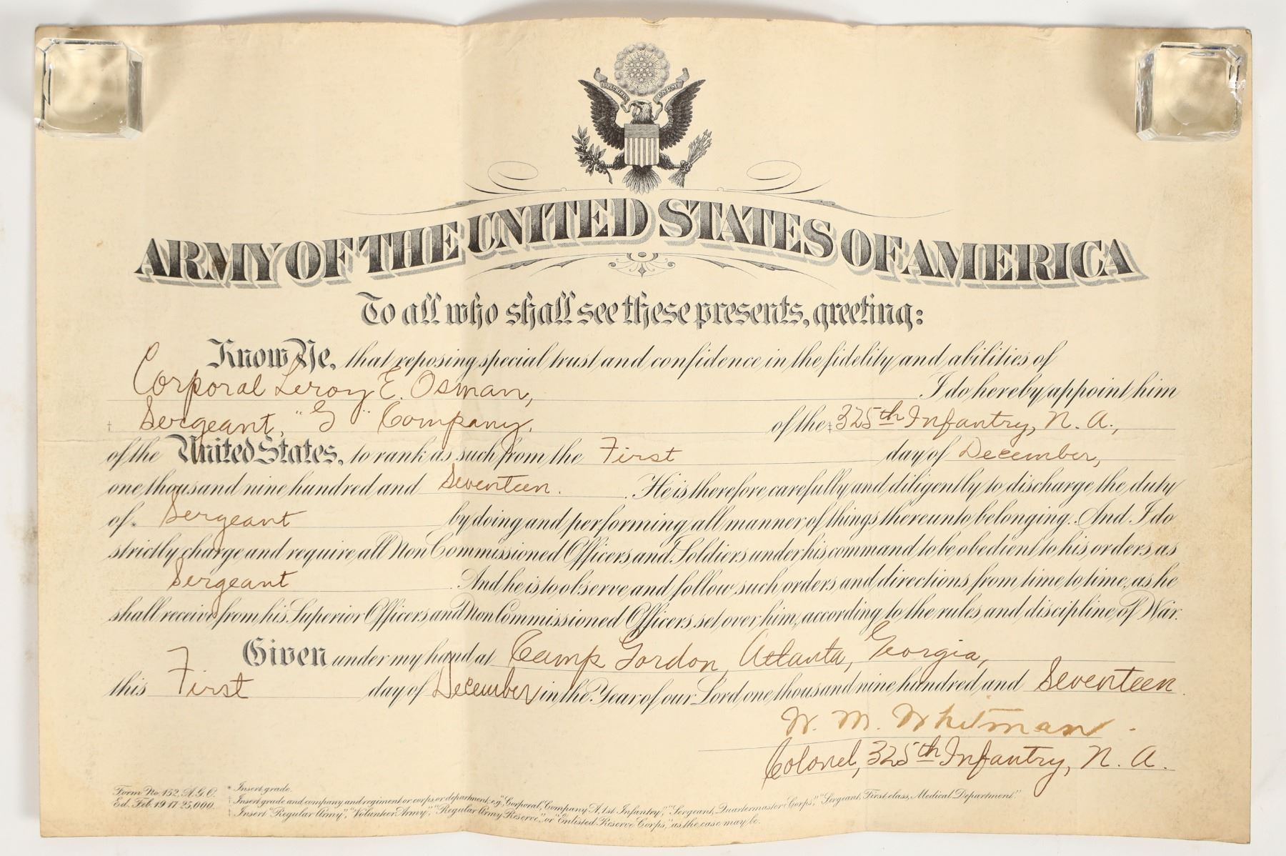 Certificate promoting Corporal Leroy E. Osman to a Sergeant of the 325th Infantry during WWI. Document is folded in thirds, with edges in good condition. See photo.