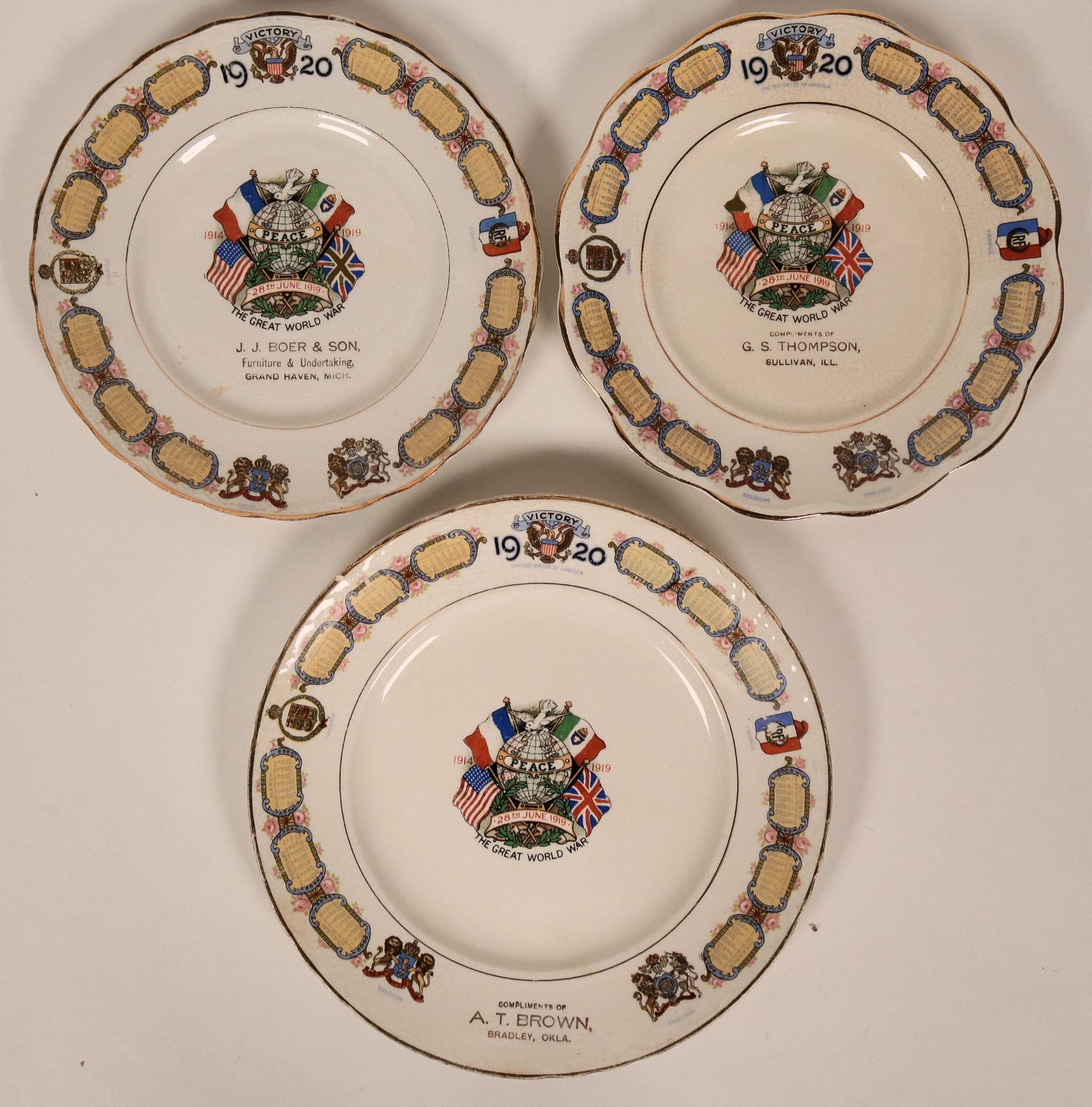 Three WWI souvenir plates: 1) 28th June 1919. Image of flags and globe "Peace". Bradley, Oklahoma. 2) Same design, Grand Haven, Michigan. 3) Same design, Sullivan, Illinois.