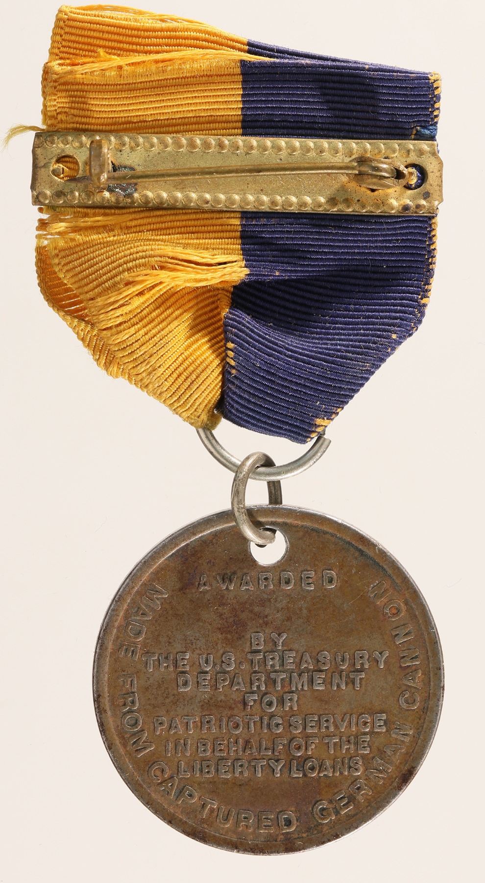 The obverse side features in its middle a picture of the White House, with an eagle underneath Around the edge of the medal is written, "VICTORY LIBERTY LOAN." On the reverse, are the words "AWARDED BY THE U.S. TREASURY DEPARTMENT FOR PATRIOTIC SERVICE IN BEHALF OF THE LIBERTY LOANS." Around the edge is written "MADE FROM CAPTURED GERMAN CANNON." From WWI, Ribbon and medal, ribbon is worn. The Government always needs more money, and the Great War, or "War to End All Wars," was to be no exception. Liberty loans or bonds were sold by the federal government during World War I (1917-1919) to raise money for the war. These were labeled as 'loans,' because they promised interest to the bearer.