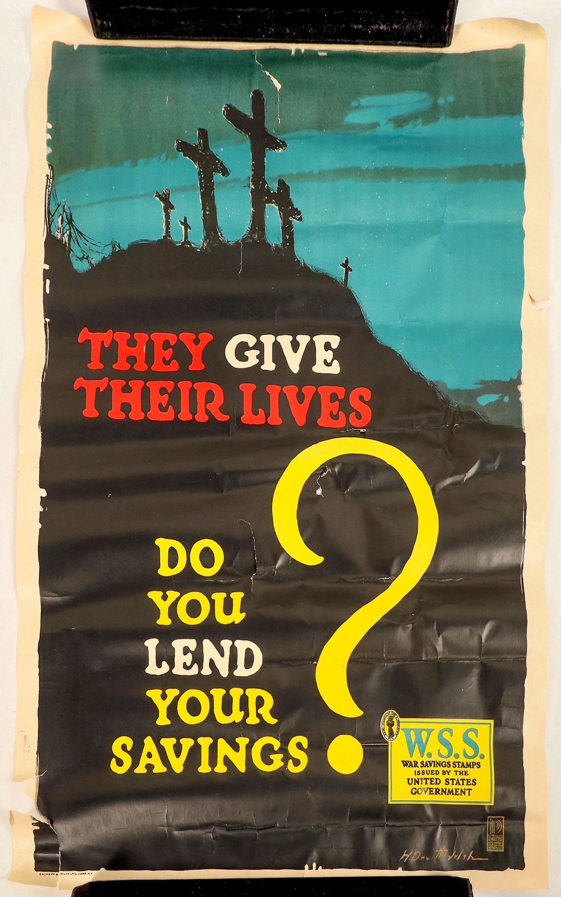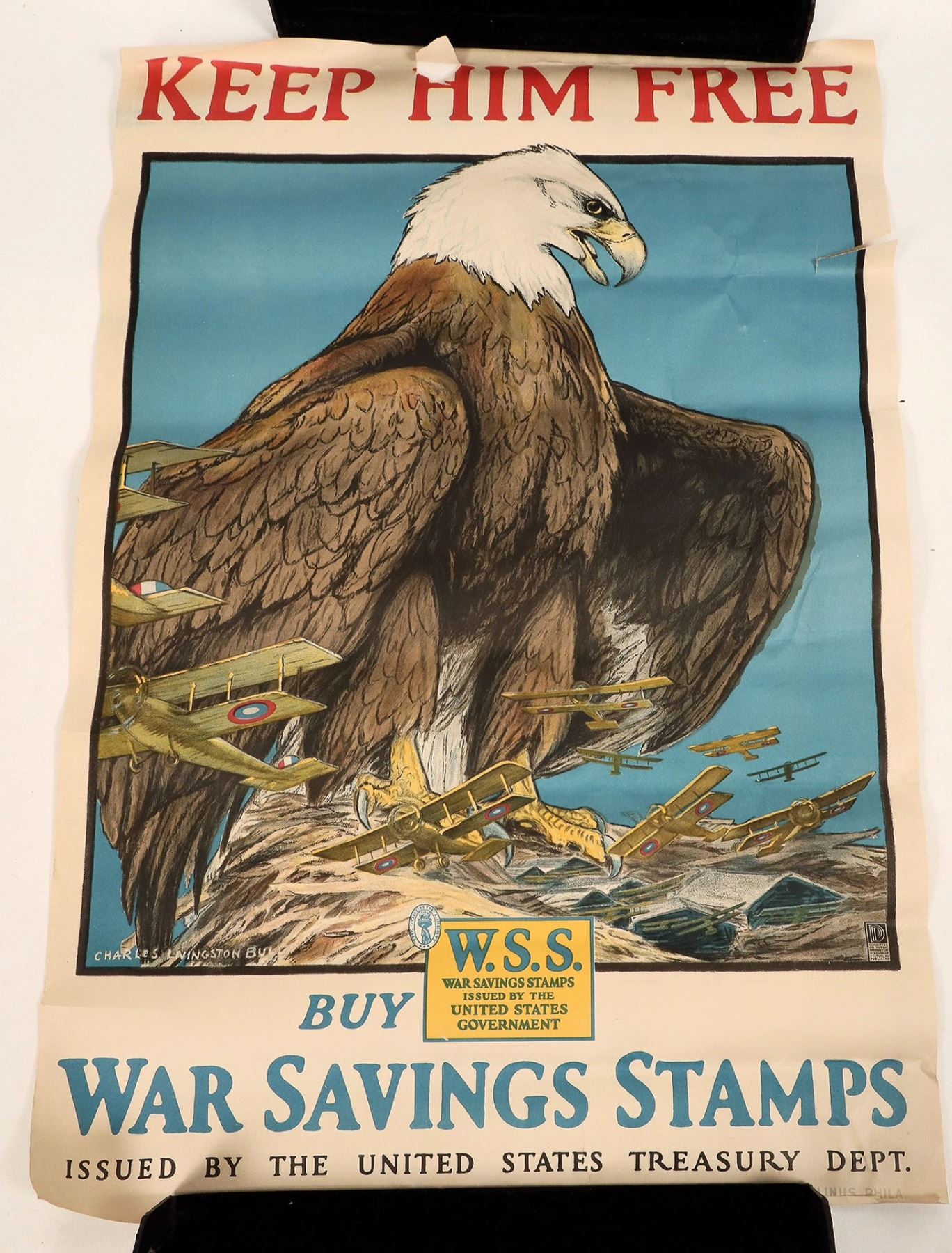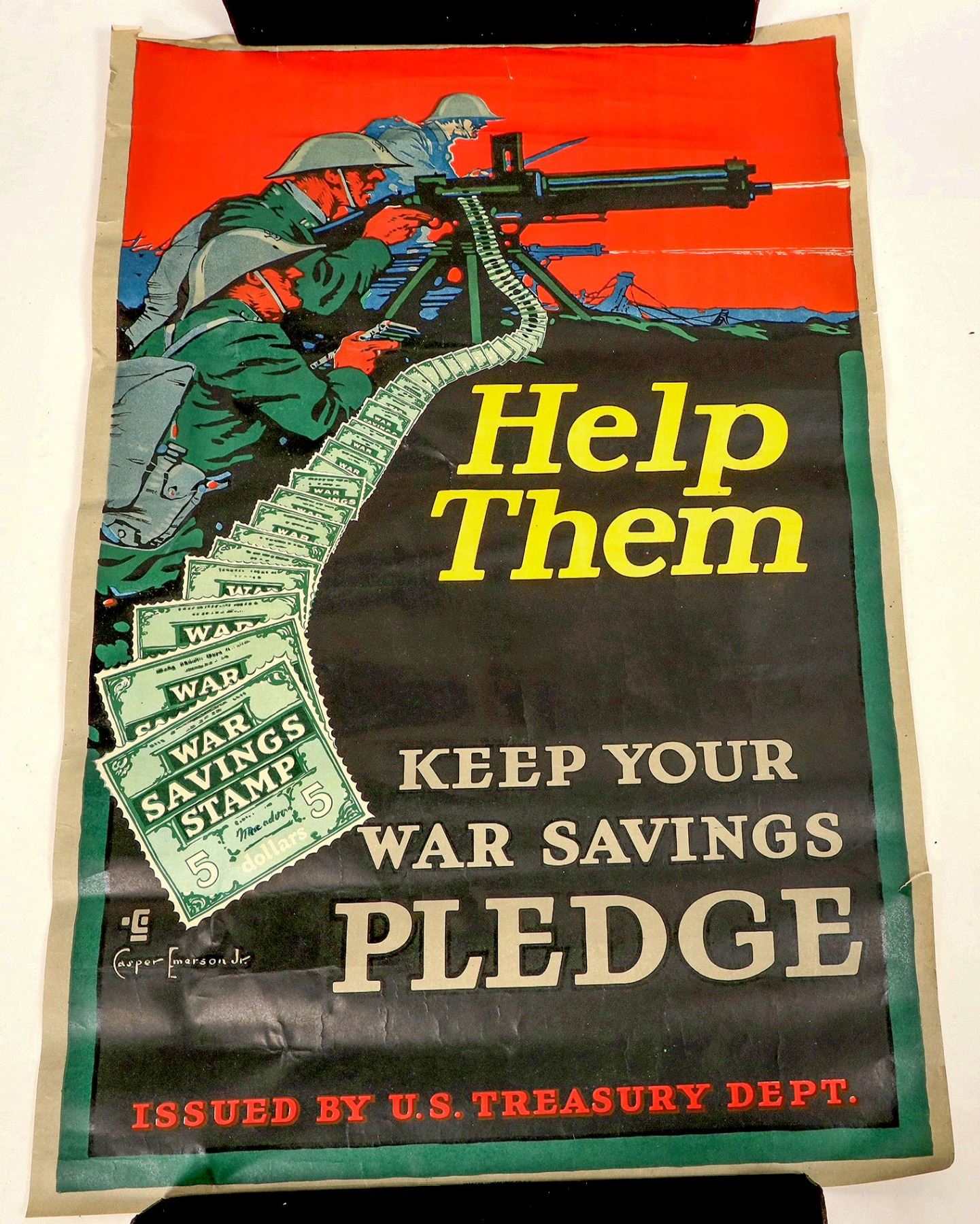 A group of three posters advertising War Savings Stamps from the U.S. Treasury Department during World War I. The posters each feature artwork and slogans related to the war effort; the artists featured are Casper Emerson Jr., Charles Livingston Bull, and Horace Devitt Welsh. Beautiful full-color prints. Some tearing around edges and creasing due to storage.