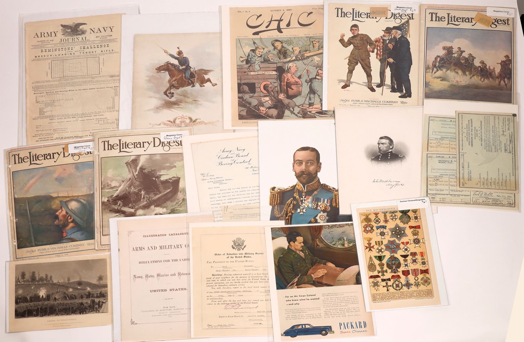 lot of 17. Size 8.5x11 to 11X14". 1. Magazine cover art ", four "The Literary Digest", Funk & Wagnall's Co. CHIC, 1880, "Old Rats Return to Democratic Hulk". Ad for Packard , 1948c. German military awards. Victorian Chromo Die Cut, German Officer.. 2. A.H. Ritchie (famed artist 1800's) engraving of Maj. Gen. C.C. Washburn, Congressman 1855-60, Union Army Brig. Gen. July1862, Major Gen. Nov. 1862, served under Grant. Later Governor of Wisconsin. 3. 1918 Order of Induction into Military Service, Navy & Civilian Board of Boxing proclamation,1919, 1874 Catalogue Arms and Military Good, three Certificates Of War Necessity vehicle permit 1942-44, 1878 Souvenir program of "Squadron A Games" of New York. 4. Print from original painting "Siege of Vicksburg" by Chapel. 5. Two copies of 1874 Army Navy Journal Gazette of the Regular and Volunteer Forces, State: City: Date:1874-40's c Provenance: Stuart Mackenzie Montana Ephemera Collection
