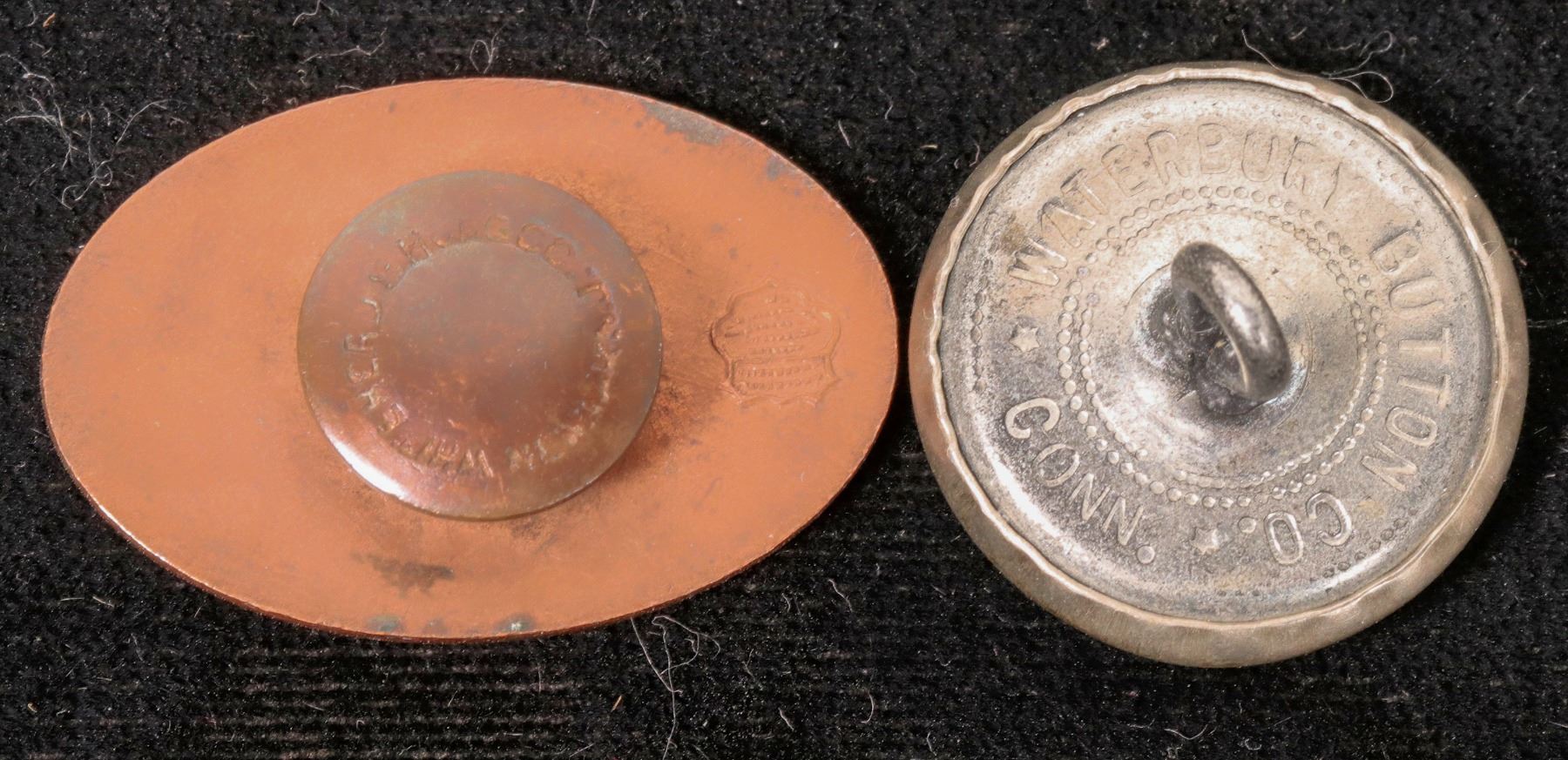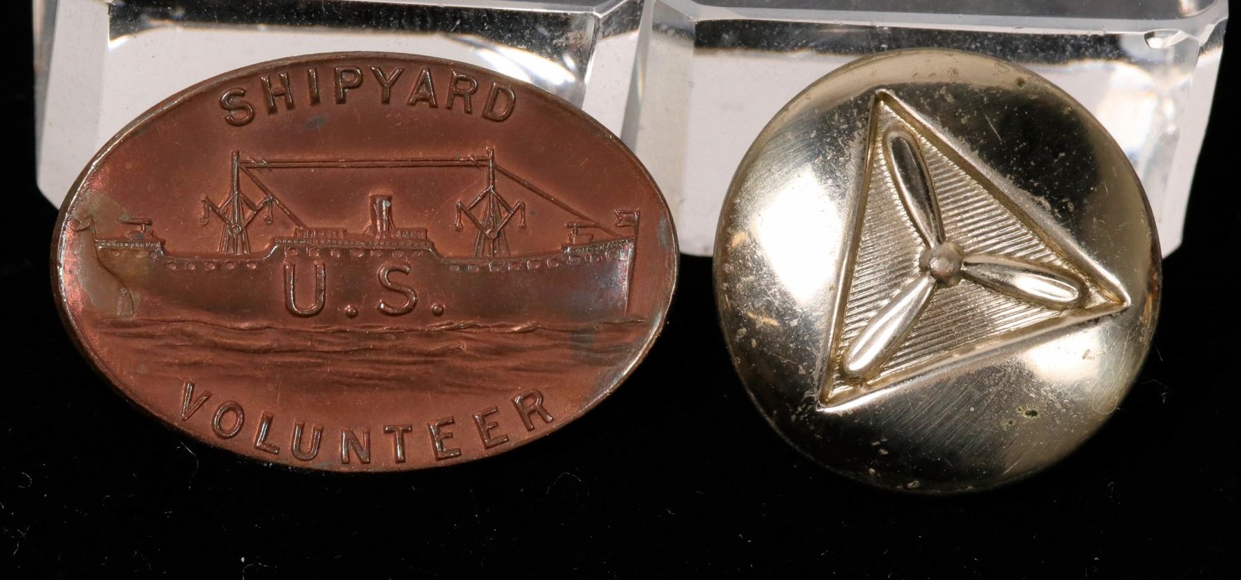 This lot of two buttons an oblong "shipyard volunteer" inland waterways button at 1.25 in. & a Civil Defense button with a three bladed prop. made by "Waterbury/ Conn." at .875 in. two piece with as fixed shank loop. [