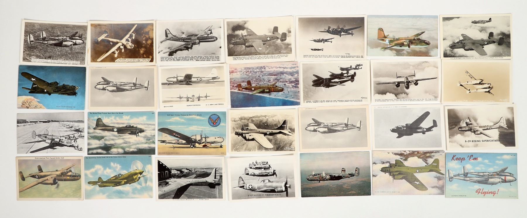 Lot of 28. Douglas B-19 (1) ~ Curtiss P-40 Hawk (1) ~ Boeing B-29 "Super Fortress"(4) ~ Lockheed P-38 "Lightning"(7) ~ Boeing B-17 "Flying Fortress"(4) ~ Consolidated B-24 "Liberator"(2) ~ North American B-25 "Mitchell"(7) ~ Republic P-47 "ThunderBolt"(1) ~ Douglas A-20 "Havoc"(1) ~ (Total of 28 postcards, 13 being real photos). Four postmarked : New York, Inglewood Ca, L.A. Ca, One has an uncanceled "Freedom of Speech" 1 cent stamp