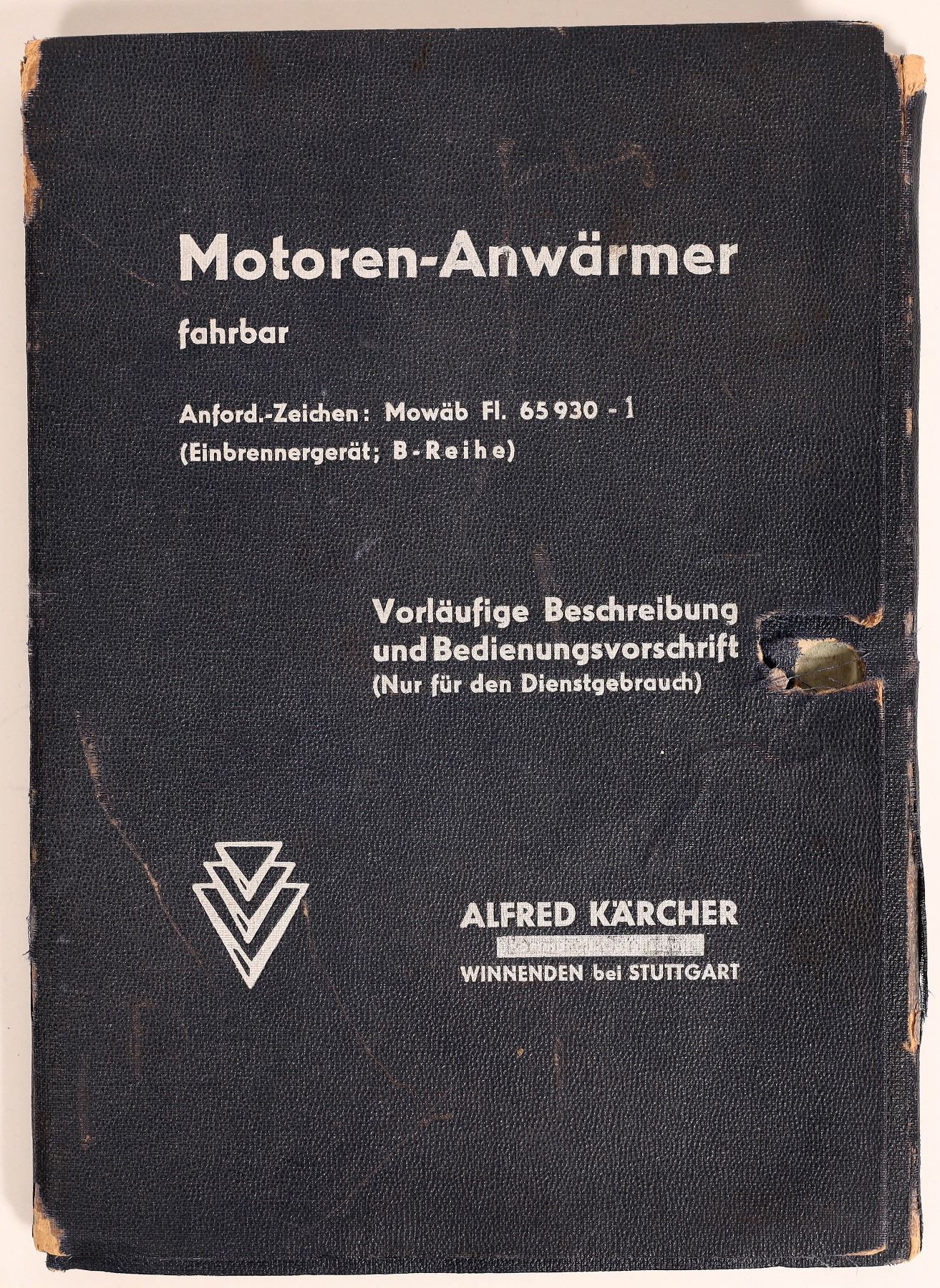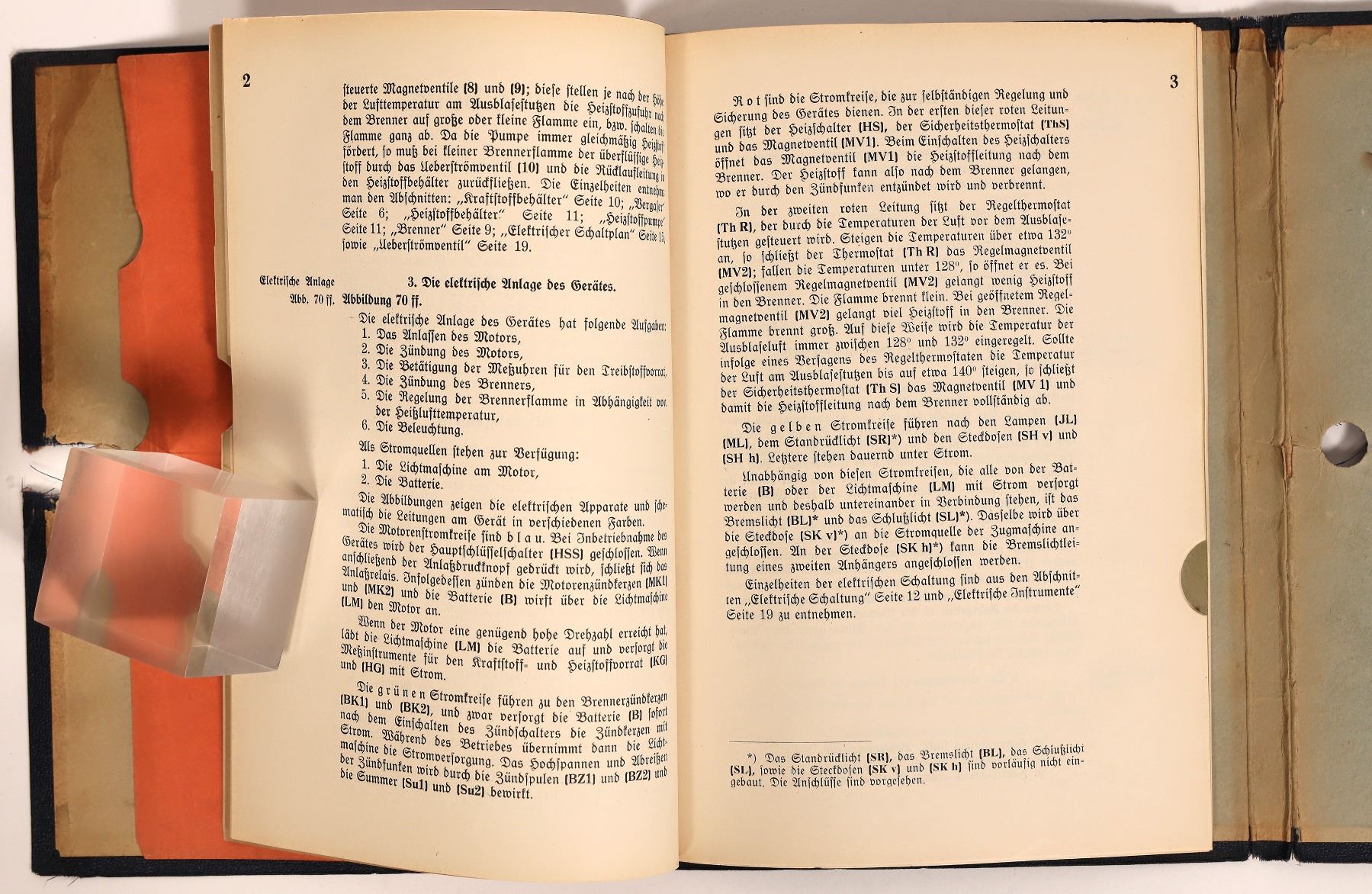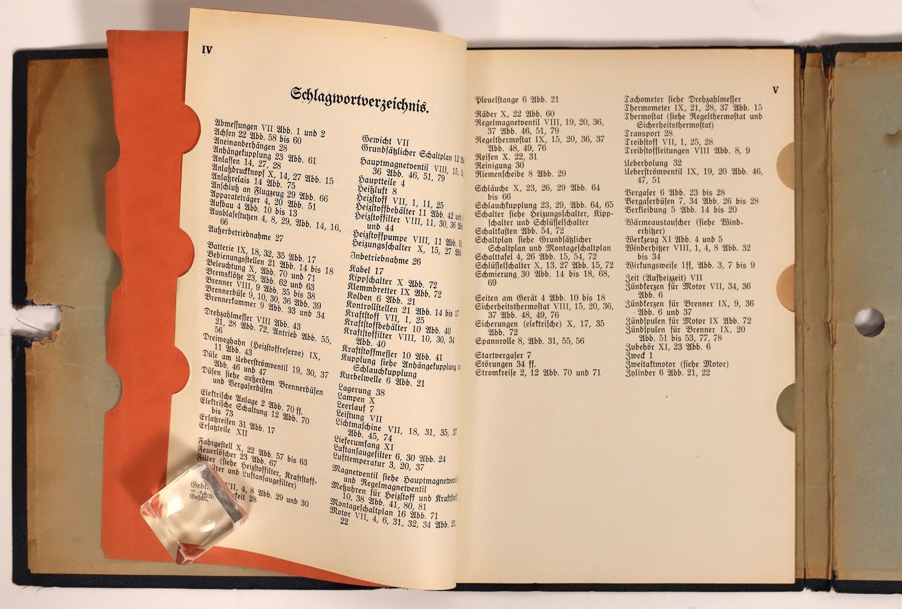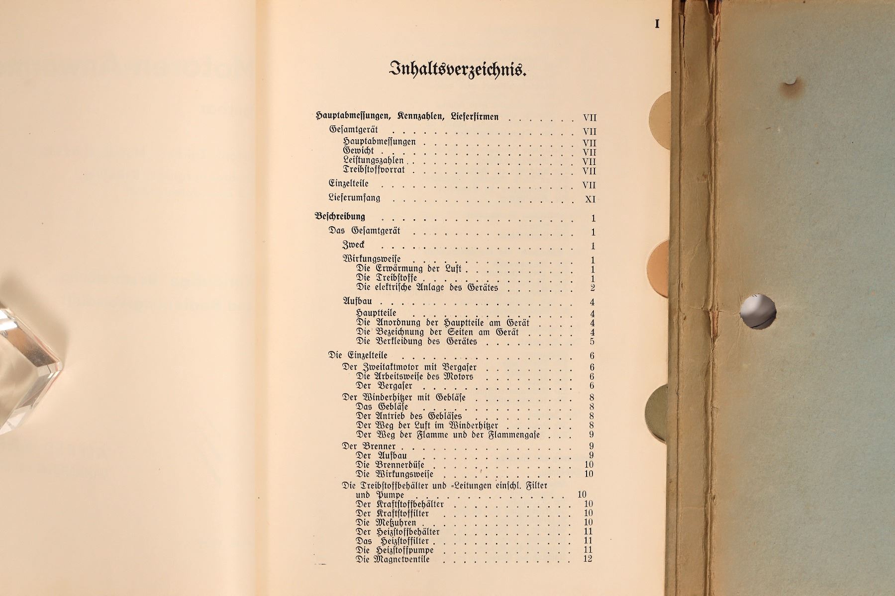 Operating manual for WWII German aircraft engine warmer. It's dated 1939 and highlights parts as well as instructions on maintaining the unit and operation. Very unique and in nice condition. Please see photos for more details.[ Germany