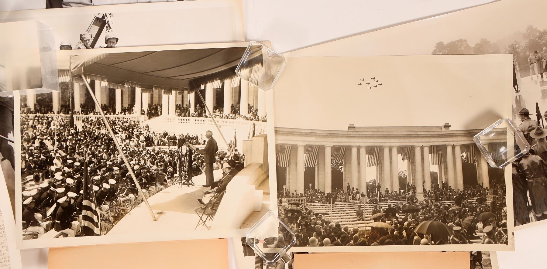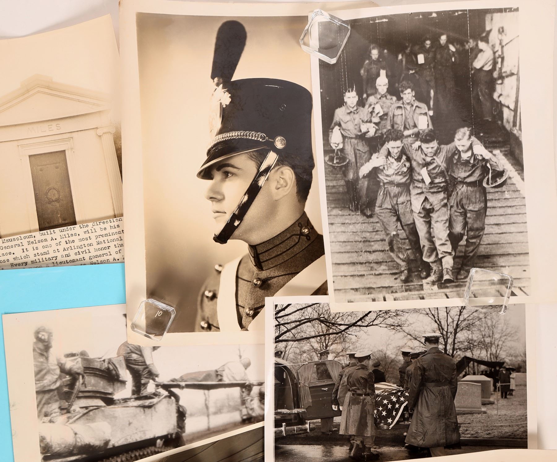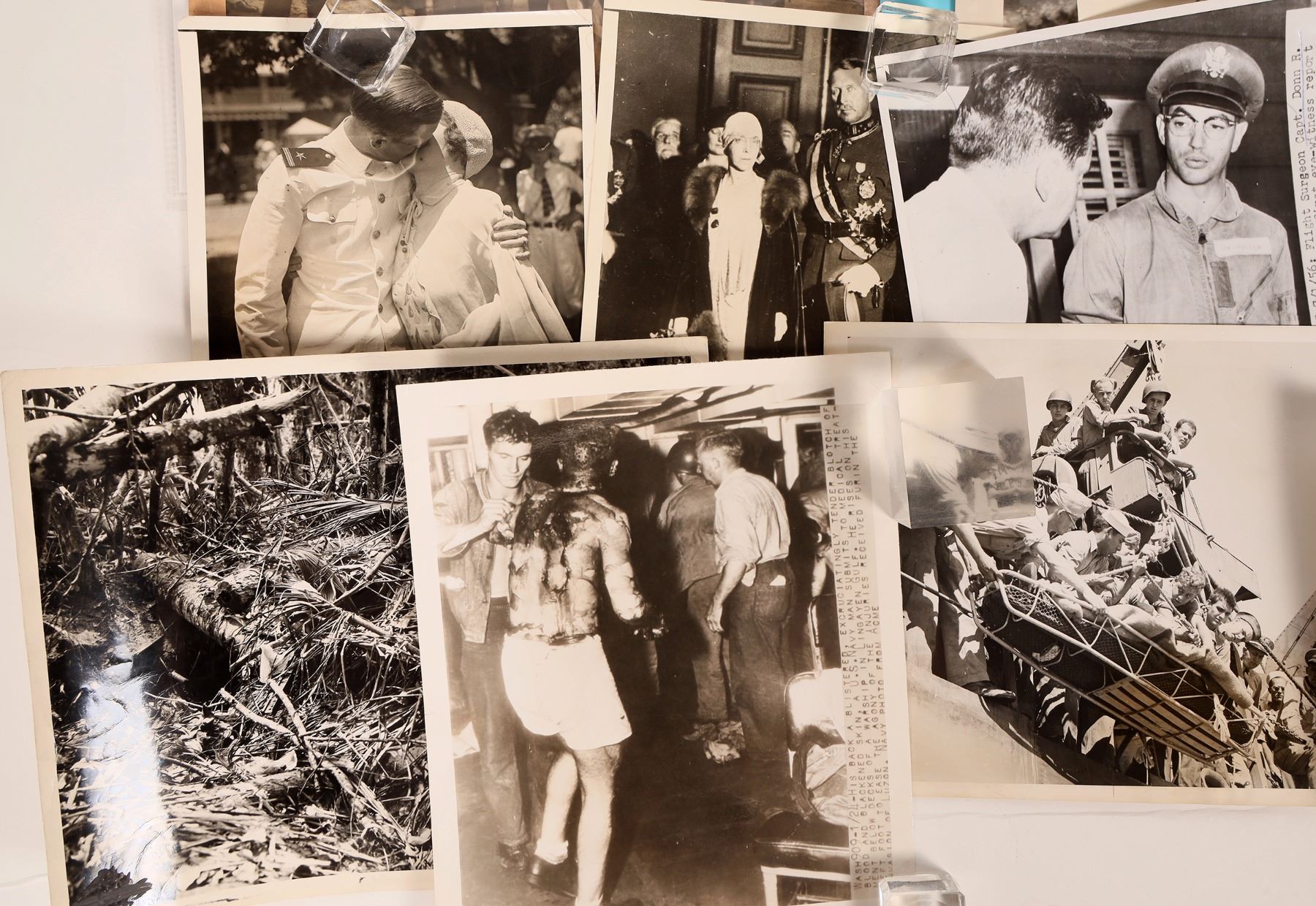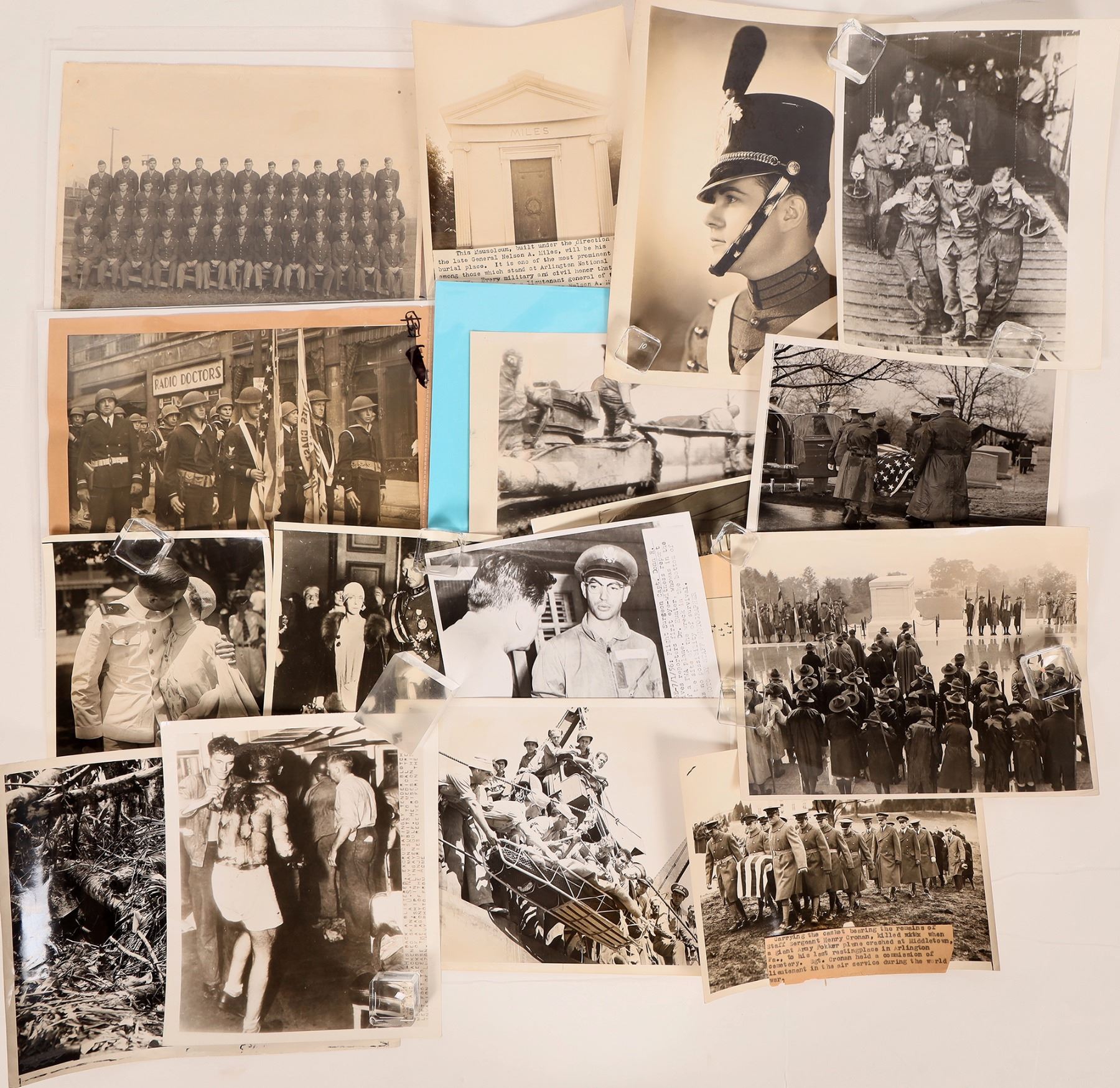 A collection of 19 original military photographs, mostly from the WWII era, c1920s-50s. The group includes a wide range of topics, from Arlington Cemetery gatherings to warfare action stills, many that appear to be original newspaper photos, & many of the U.S. Navy. Please see photo(s) for more details. [
