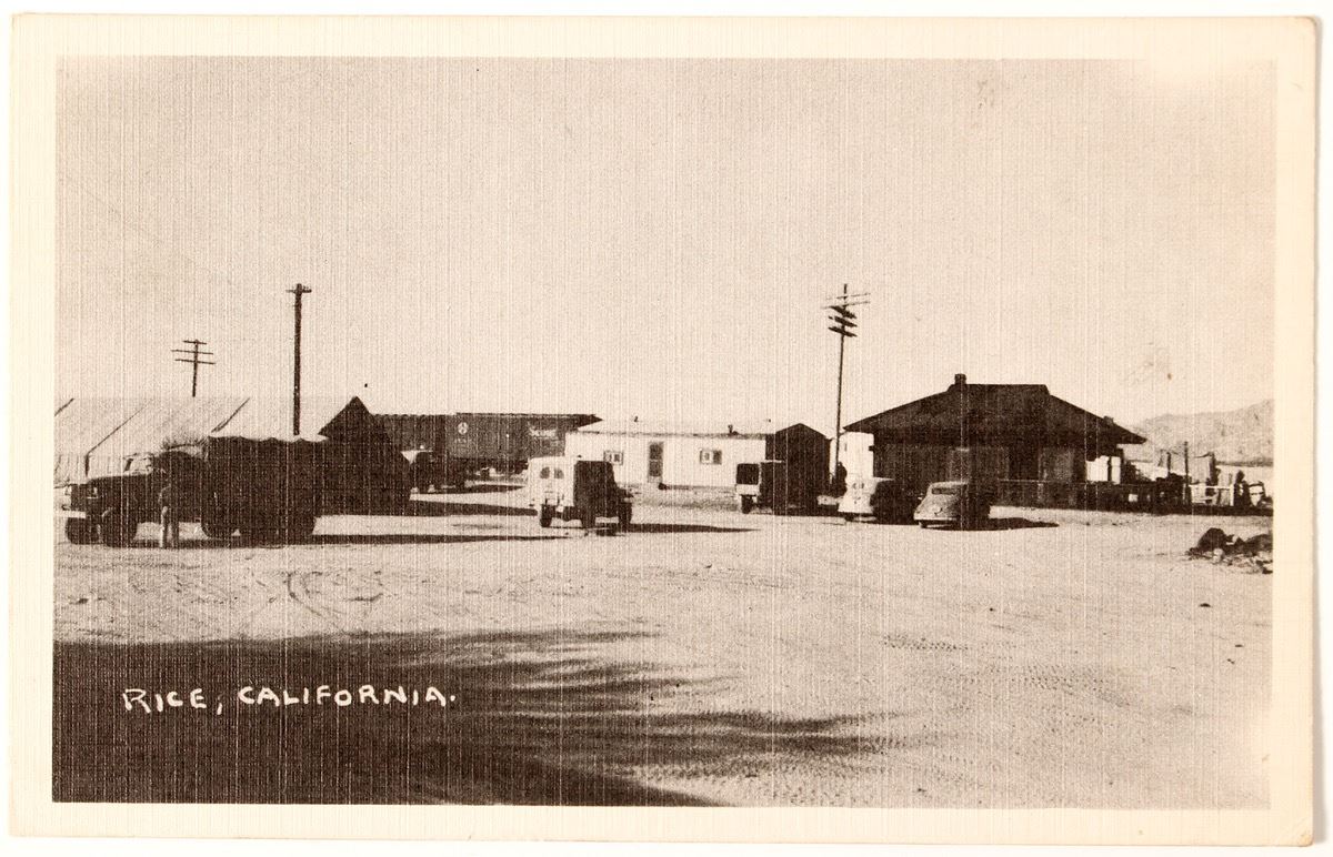 The private got to mail this card for free from "the big town we are near," and announced they were pulling out. Rice California, formerly named Blythe Junction, is in the Rice Valley at the southern tip of the Mojave Desert.