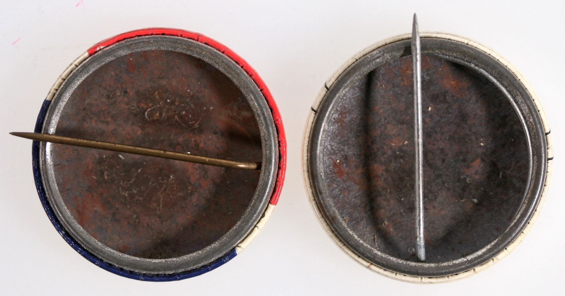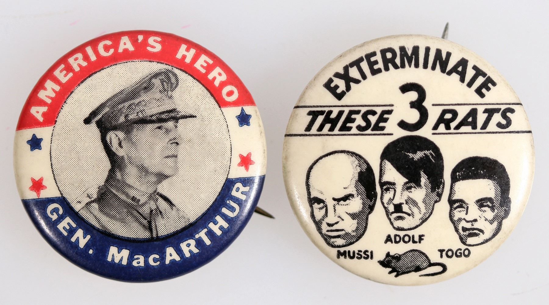 Lot of 2. both 1 3/4" 1. "Exterminate These 3 Rats" w/drawings of Hitler, Mussi, Togo. rat on bottom. Unk. Printer. 2. Gen, MacArthur on bottom, his photo in center, top "America's Hero". Red-wht-blu w/stars. Unk. Printer.