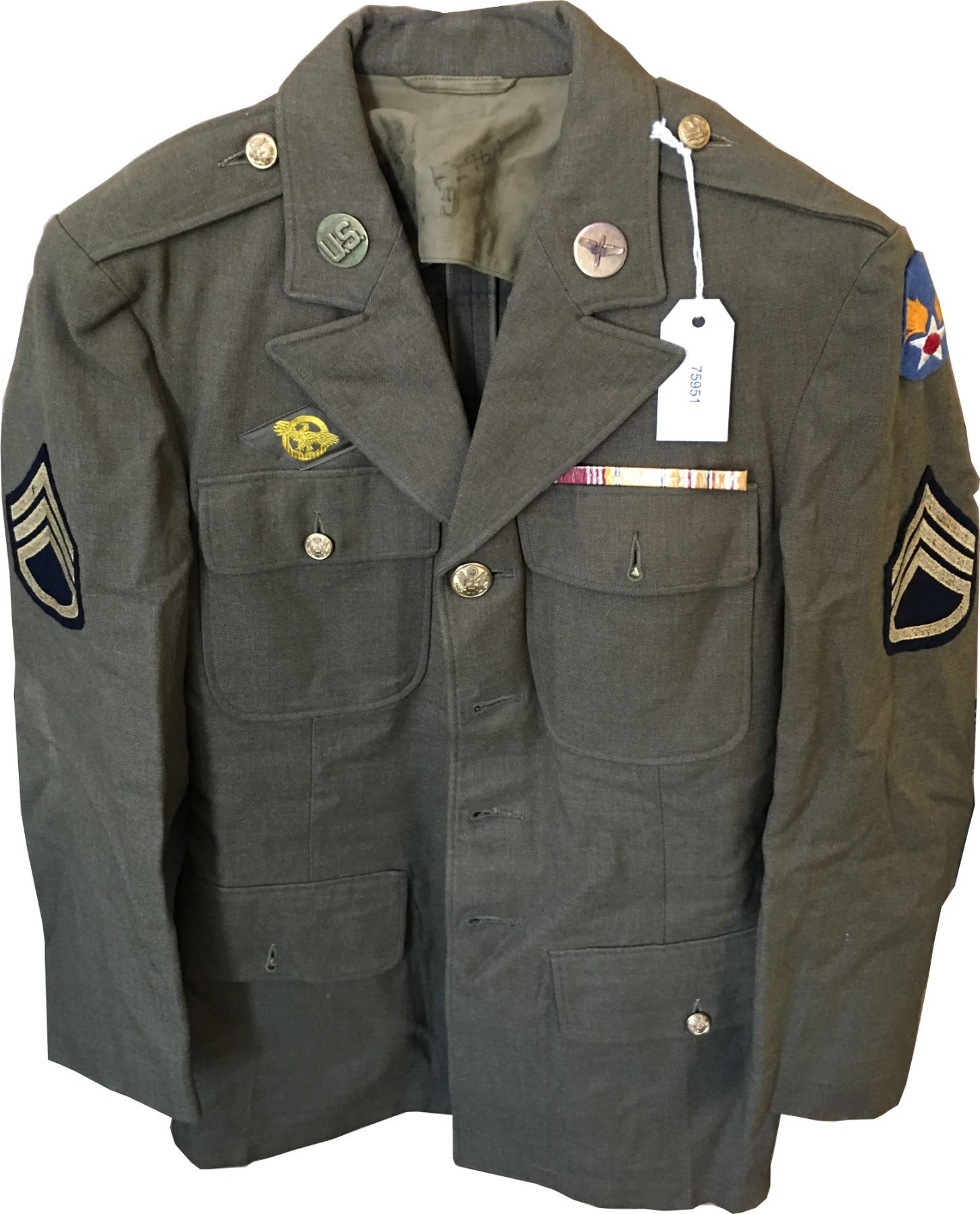 This is a U.S. Army Aviation Dress Jacket from WWII with insignia for the rank of Staff Sergeant, Enlisted Aviation collar insignia with the less common screw back variety, beautiful wool felt Army Air Corps Unit patch, Honorable Discharge patch, and ribbons for the Good Conduct, American Defense, and Asiatic Pacific Campaign medals. State: City: Date: