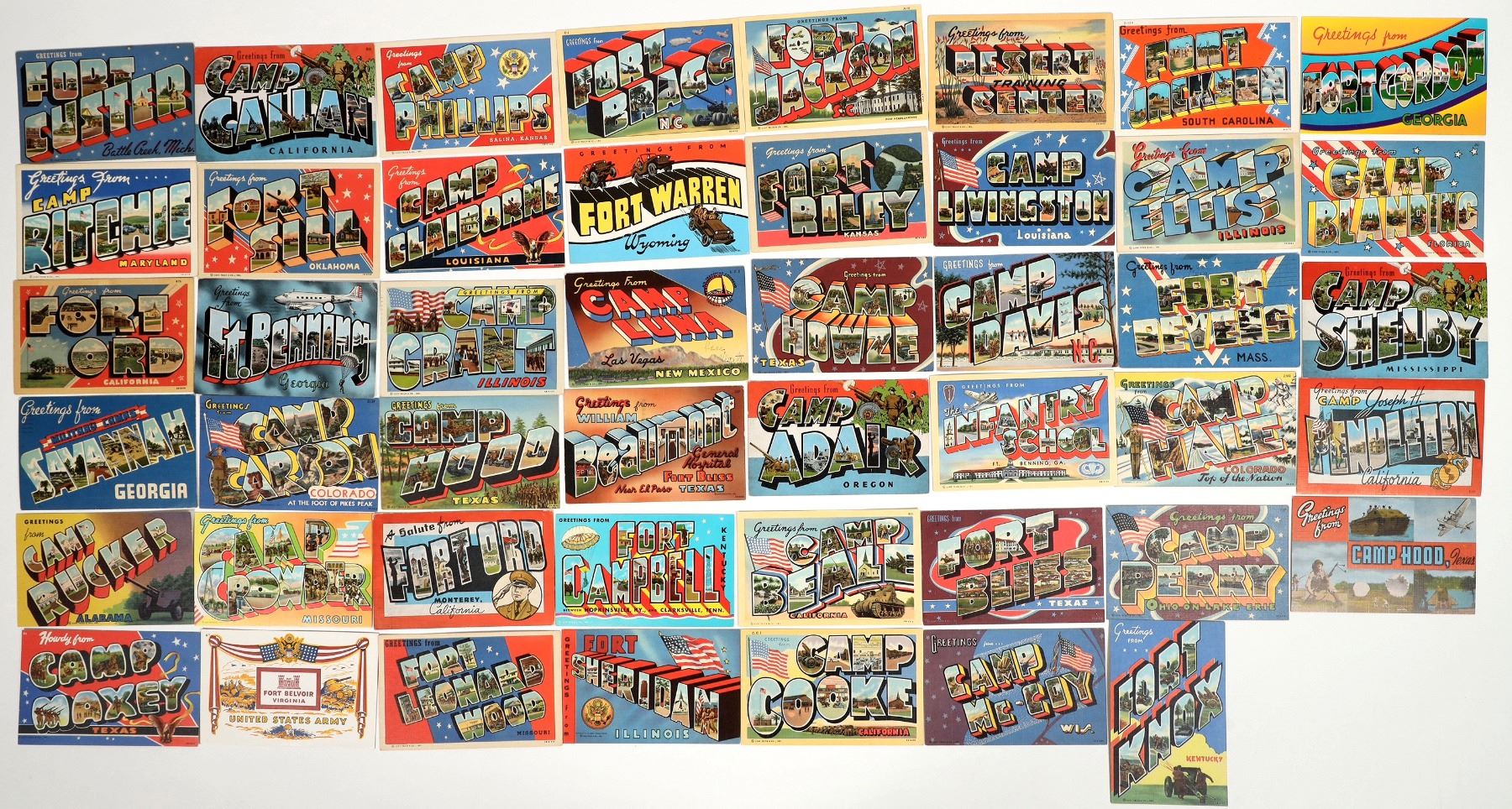 Lot of 48. (All in Color on Linen ~ No Duplicates) . Twelve postmarked : Chicago, Colorado Springs, Camp Stewart, Camp Davis, Fort Benning, Fort Ord.