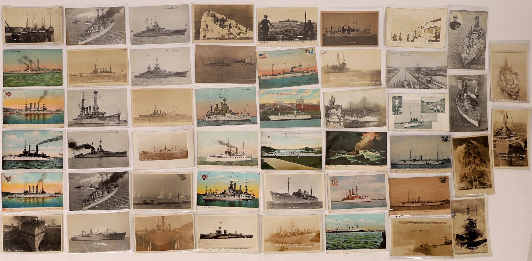 A collection of approx. 48 postcards picturing US Navy ships and Navy life in the era bracketed by WWI and WWII. Good images of the state-named battleships such as the Arizona, Wyoming, New Mexico, Idaho, New Jersey, Maine, Iowa, North Dakota, and Arkansas. Also city-named ships such as Atlanta, Monterey, Memphis, Itasca, Cheyenne, and Baltimore. Three show the USS Bennington after a boiler explosion.