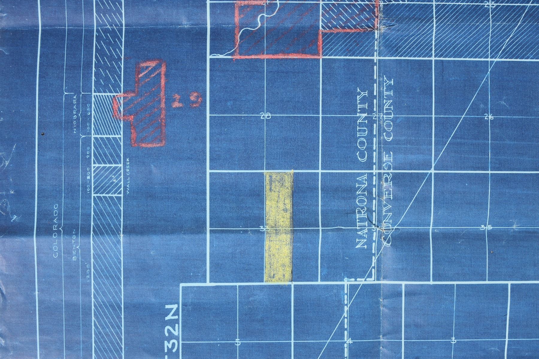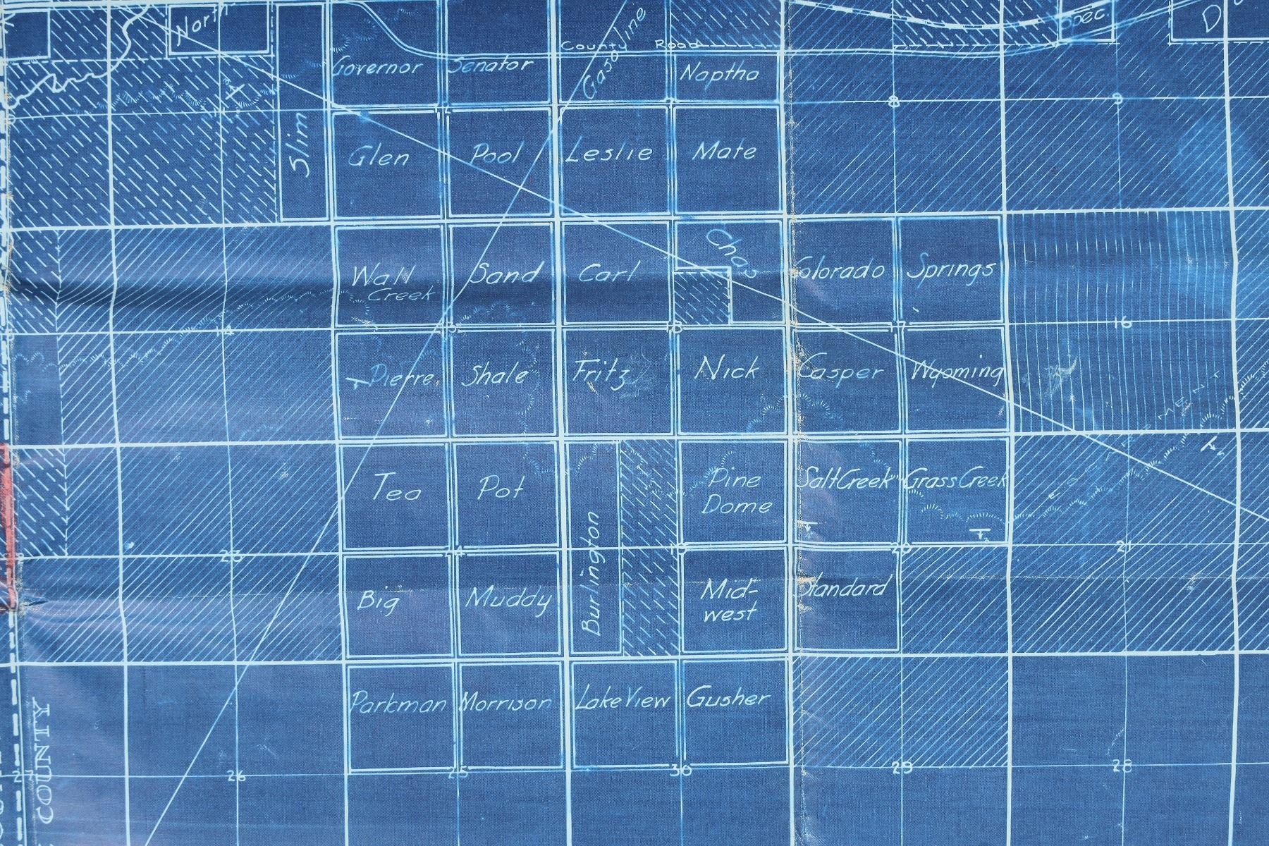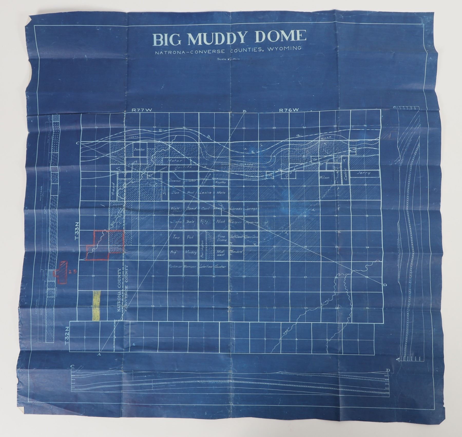 Wyoming oil exploration schematic/blueprint. Titled "Big Muddy Dome" of Natrona-Converse Counties, WY. Made of sturdy semi-gloss paper, with moderate foxing on the back. Several folds. Measures 27.5x26.5". See photo.