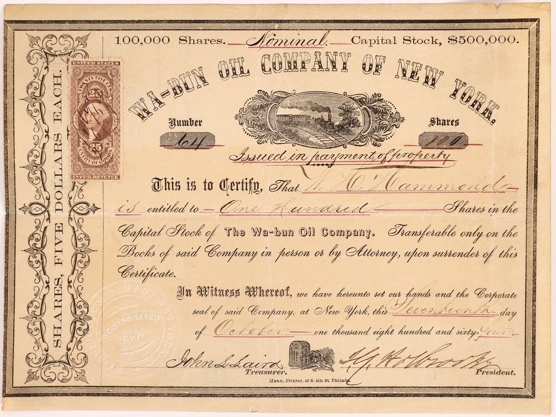 No. 64, issued for 100 shares to WH Hammond in New York in 1864. Signed by president JG Holbrooke and treasurer John Laird. Not cancelled. Black border and print, small vignette of locomotive. Printed by Mann, Philadelphia. 25 cent US IR Entry of Goods stamp attached at upper left. 6.5 x 8.5" Folds, toning. No additional information located. Properties probably in Pennsylvania. New York Ken Prag Collection
