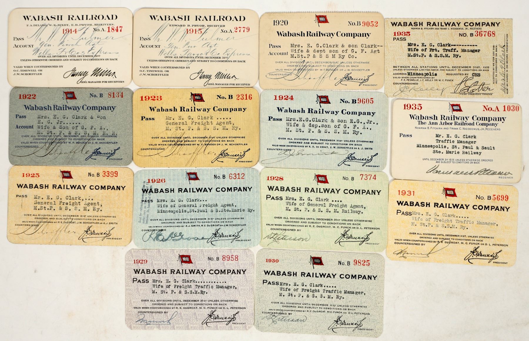 Group of 14 railroad passes from the Wabash Railroad. Passes date from the early 1900s; see photos for specific years and additional detail.