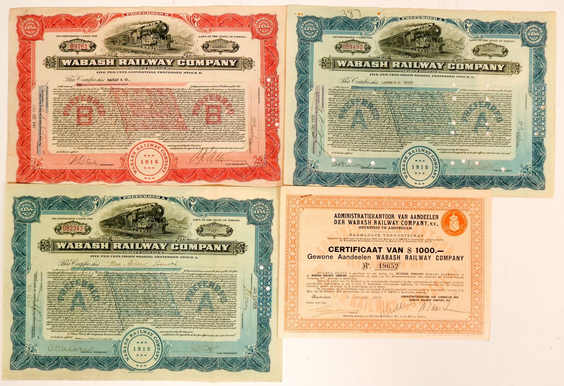 4 certificates. Incorp. Indiana 1915 it served a large area, including track in the states of Ohio, Indiana, Illinois, Iowa, Michigan, and Missouri and the province of Ontario. 1. Three certs: Preferred, imprinted seal, vignette top 4-6-2 l-r w/pullman cars. Republic Bank Note Co. #089490, I/C, Blue issued 1926. #082343, I/U, Blue issued 1929. #09761, I/U , issued 1937. 2. #19652, I/U, $1000 in shares. Written entirely in Dutch, Orange, no vignette, imprinted Dutch revenue stamp Administer Wabash Railroad Company in orange underprint. 1-30 coupons attached. N.V. Amst Book and Stone printer.