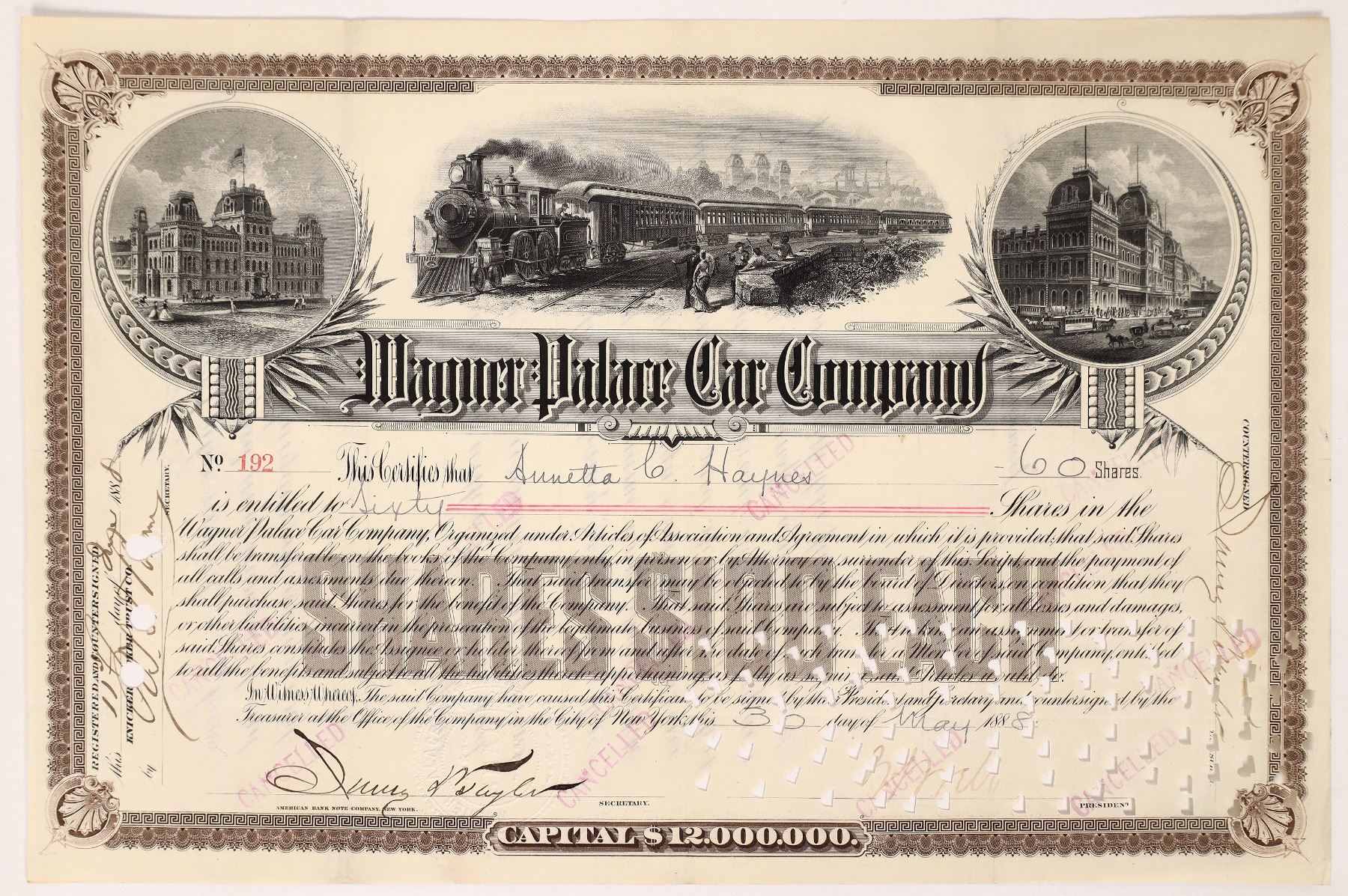 Wagner Palace Car Co. stock, issued for 60 shares to Anneta Haynes May 30, 1883, signed by (illegible). i/c. Cert 192. 8 x 12"