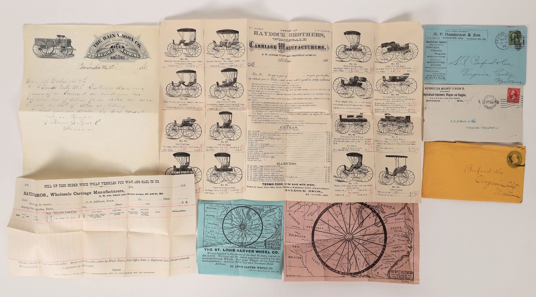 2 c. 1899 buggie advertising covers with contents. 1888 pictorial letterhead. 2 small and 1 large paper advertisements, nice pictorial price list sheet.