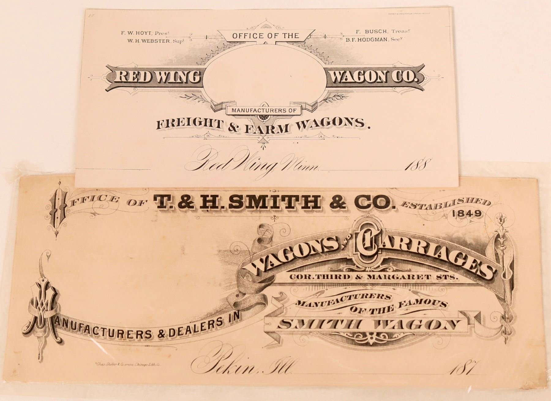 Lot of two printers' proofs for wagons and carriages advertisements, c1870-1888. Includes T&H Smith & Co. Wagons and Carriages, from Pekin, Ill. est. 1849, 4 x 8 inches, Chas Shober & Co. props. Chicago Lith. Co.; and Red Wing Wagon Co., in Red Wing, Minn., 3 x 6 inches, Shober & Carqueville Lith. Co., Chicago. See photo for details.