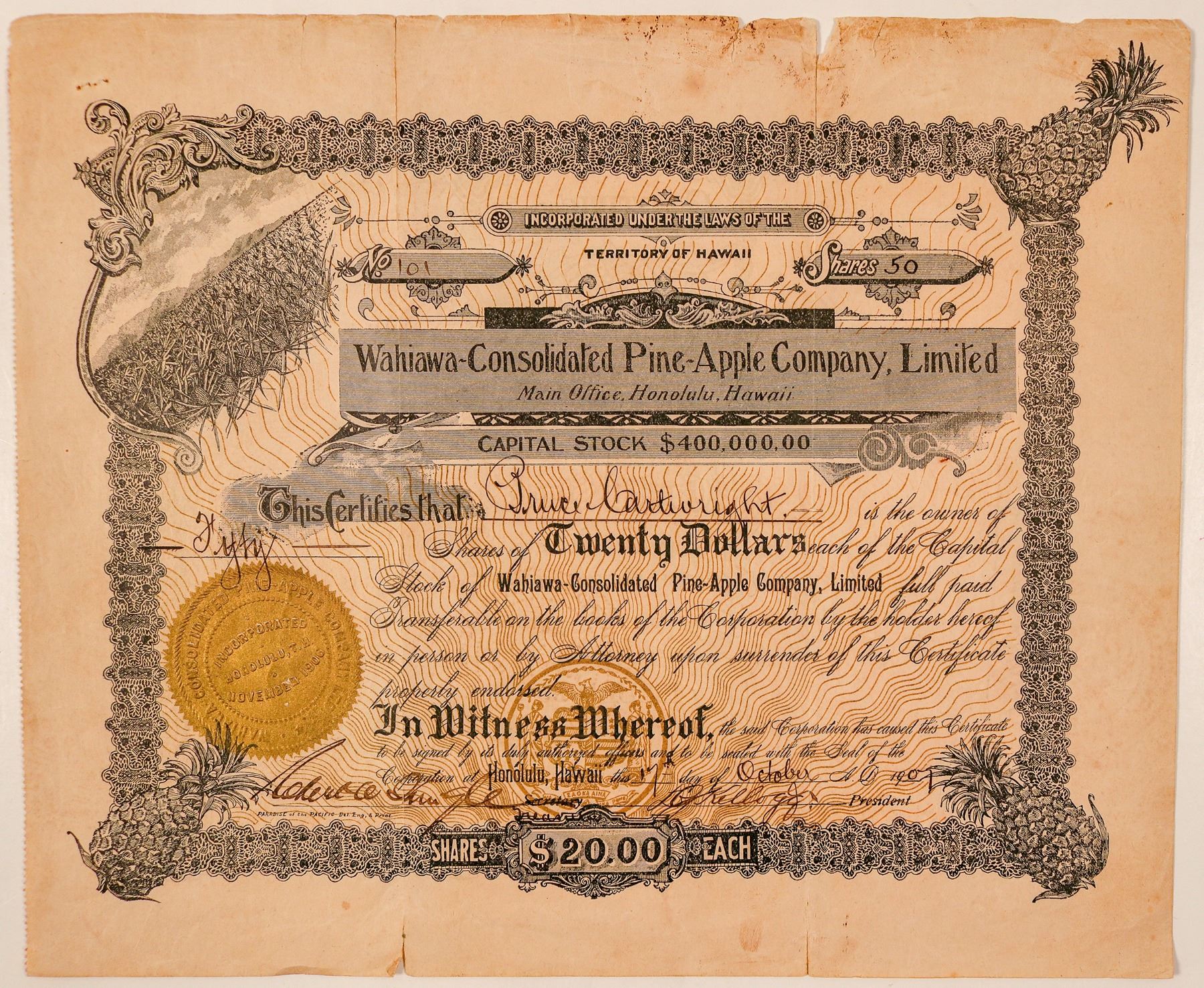 Inc. in the Territory of Hawaii. No. 101, issued for 50 shares to Bruce Cartwright on Oct. 17th, 1907 in Honolulu. Signed by president Kellogg and the treasurer (illegible). Black border with pineapple vignettes. Also vignette of pineapple field. Printed by Paradise of the Pacific. Heavy folds with tape repaired separation, soiling, etc. Please inspect. As-is. 9.25 x 11.25" Bruce Cartwright is the son of Alexander Cartwright, an important Hawaii figure and also known as the "father of baseball." The Wahiawa area is best known today for pineapple and was once the pineapple capital of the world. Ken Prag Collection