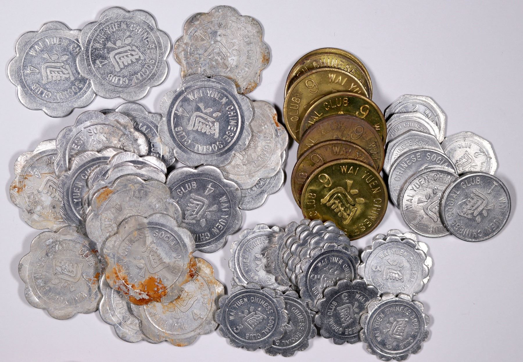 Wai Yuen Chinese Social Club gaming tokens of small denominations: 1 (3); 2 (4); 3 (15); 4 (19); 6 (7). Noted on pages 31 and 99 of Jerry Schimmel's "Chinese-American Tokens from The Pacific Coast." Schimmel notes the club was at 933 Stockton Street in 1940's directory.