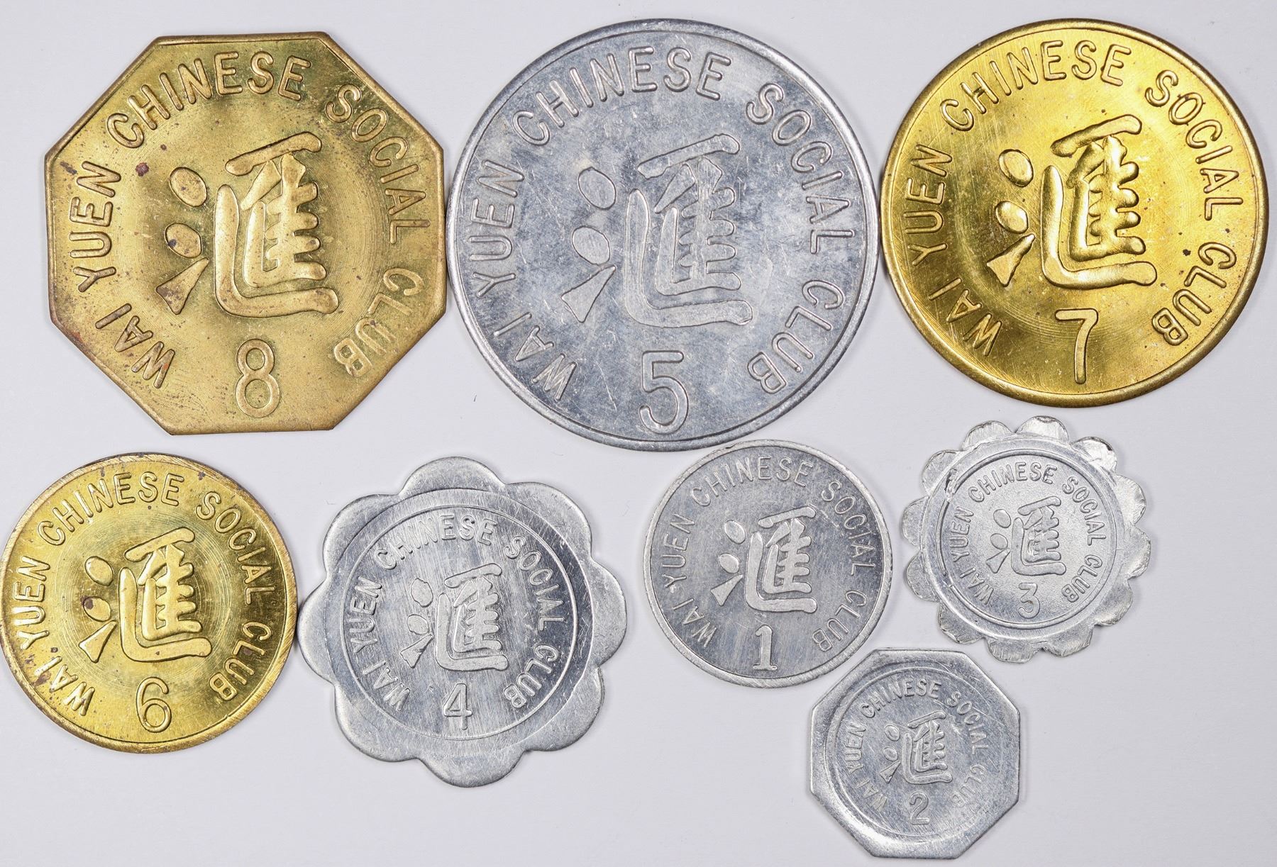 Lot of eight gaming tokens from the Wai Yuen Chinese Social Club. All different, mostly uncirculated. Denominations are 1 through 8. Noted on pages 31 and 99 of Jerry Schimmel's "Chinese-American Tokens from The Pacific Coast." Schimmel notes the club was at 933 Stockton Street in 1940's directory.