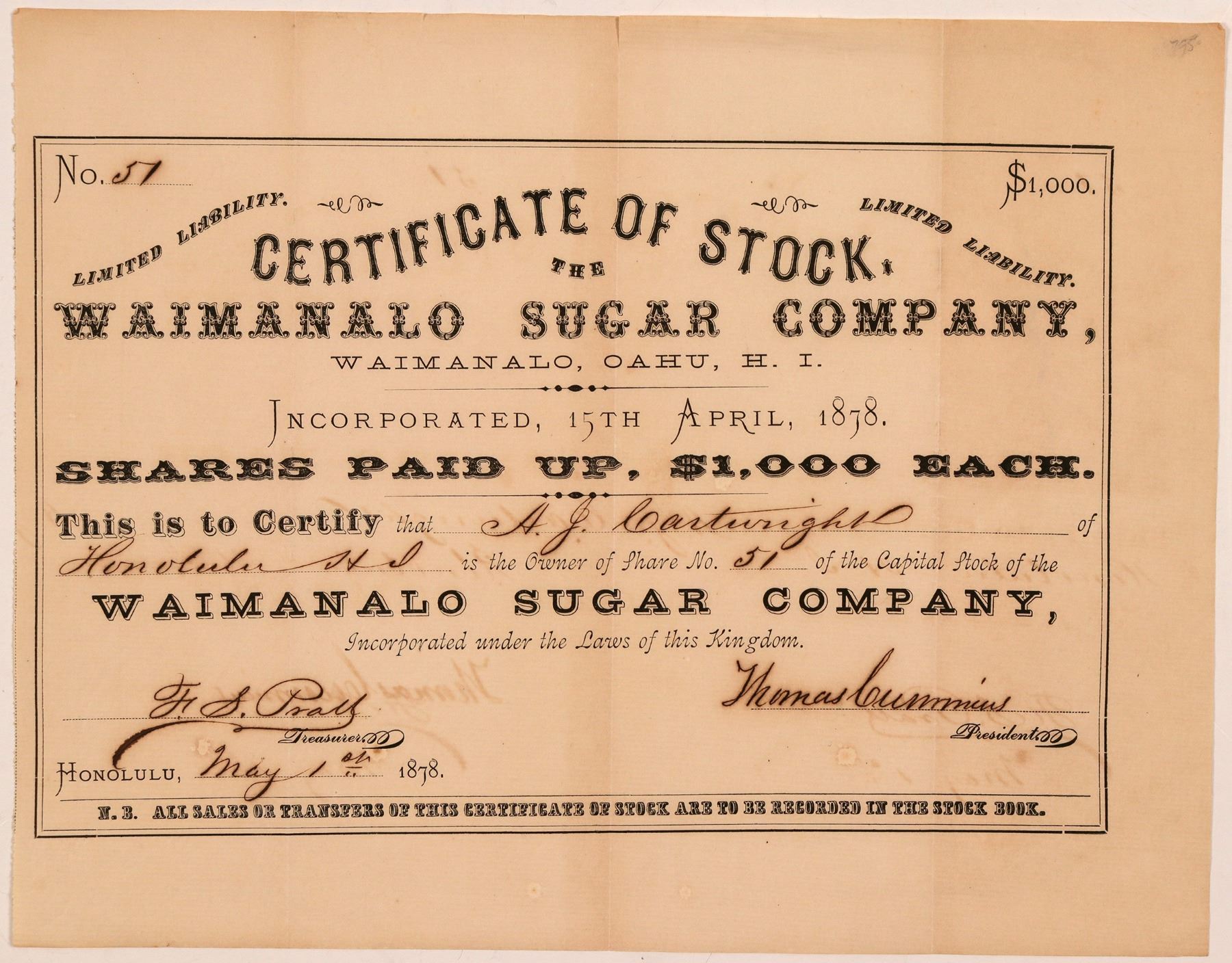 Extra rare and tons of Hawaii history embedded in this stock. Location printed below title: Waimanalo, Oahu, H.I. Inc. April 15th, 1878 in Honolulu. No. 51, issued for one share to AJ Cartwright on May 1st, 1878. Not endorsed by Cartwright. Signed by president Thomas Cummins and treasurer F.S. Pray. Not cancelled. Black border and print. 8.75 x 11.25" Folds, creases, some toning. Alexander J. Cartwright is considered to be the "father of baseball" having been the first to diagram a baseball diamond and creating rules that were incorporated from his Knickerbocker firefighter "town ball" club in New York during the 1840s. Cartwright moved to the Hawaiian Islands after heading to California during the Gold Rush. He served as Honolulu fire chief from 1850-1863 and encouraged the monarchy to bring the game of baseball to Hawaii. He died in 1892. John Adams Kuakini Cummins was a High Chief born on Oahu on March 17, 1835, the son of High Chiefess Kaumakaokane Papali'ai'aina and Thomas Jefferson Cummins, Jr. His mother was a cousin of King Kamehameha I. His father was a wealthy and aristocratic Englishman, born in Lancashire and reared in Massachusetts, who came to the Islands in 1828. Cummins was instrumental in helping King Kalakaua effect a reciprocity treaty with the United States in 1874, after which the sugar industry prospered. The first mill of this company started grinding cane in January 1881. Ken Prag Collection