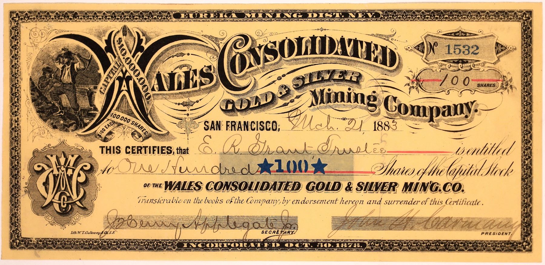 Incorporated October 30, 1878. Number 1532 for 100 shares to E.R. Grant Trustee on March 21, 1883. Signed by president John Carmany and secretary JH Applegate. Eureka Mining District. Black border. Number 100 is stamped in blue on line for shares. Vignette: left top of miner with pick and 2nd miner in background. Good condition. Printer: W. Galloway & Co S. F. Information on this mine from ten newspaper articles from 1878 to 1883 are included.