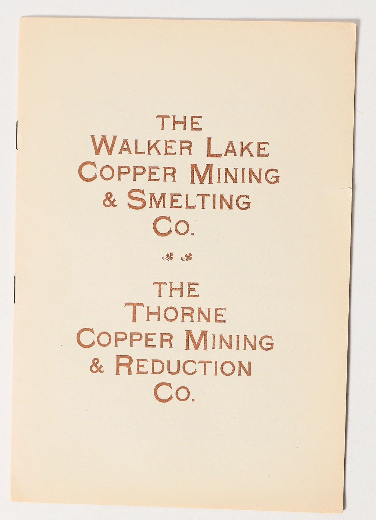 Prospectus for the Walker Lake Copper Mining & Smelting Company and the Thorne Copper Mining & Reduction Company. Lists production at the end and stops at 1905, so likely issued in 1906. 15pp. Rare district located in the opened Indian Reservation land near Walker Lake. Toning, minor wear.