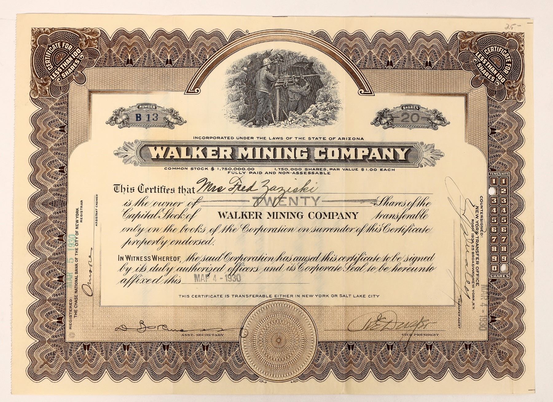 Issued 1930 Walker Mining stock. Issued to Mrs Fred Zaziski, part of a famous California mining family in Portola. See Mines Handbook, 1920, page 492 for info on this major copper mine.[ Arizona