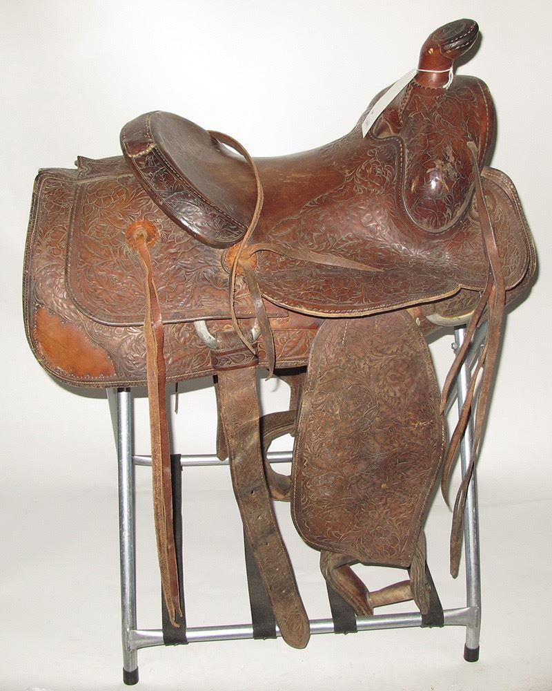 D.E. Walker of Visalia saddle.Marked on back of 14" seat, c 1958.Exceptional Tame Rose stamp pattern throughout. Relined and repaired. Date: Location: HWAC# 56449