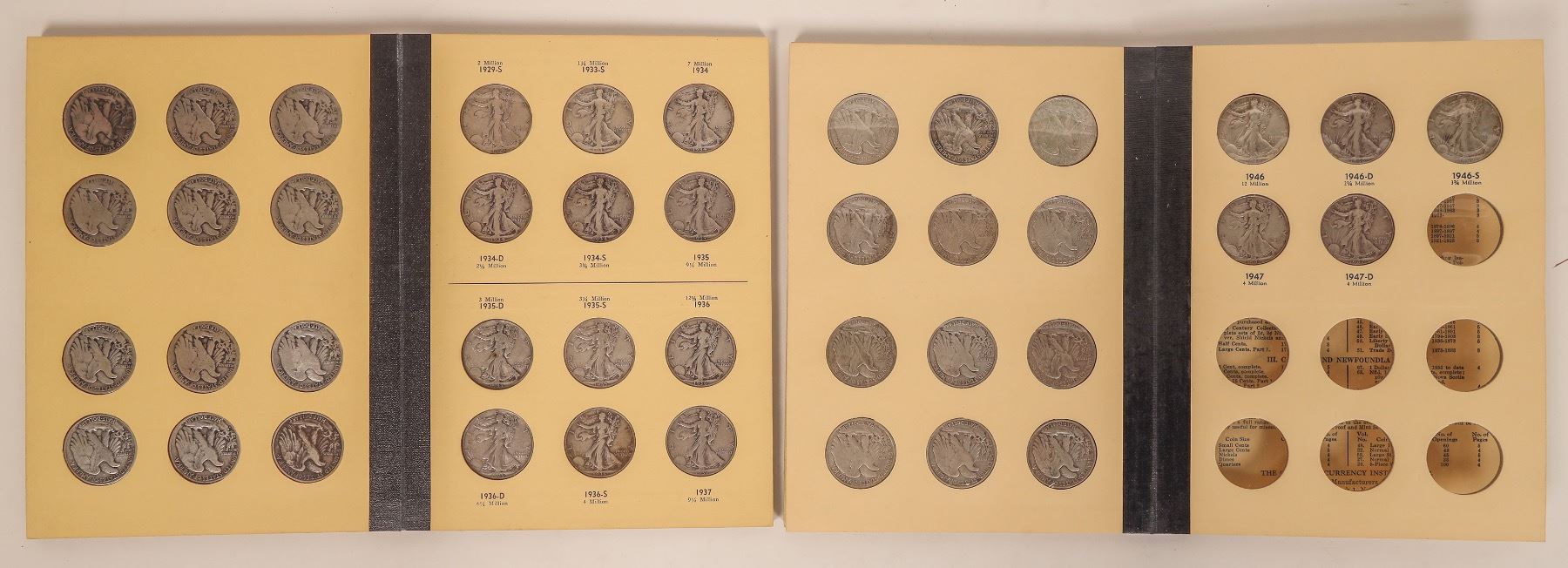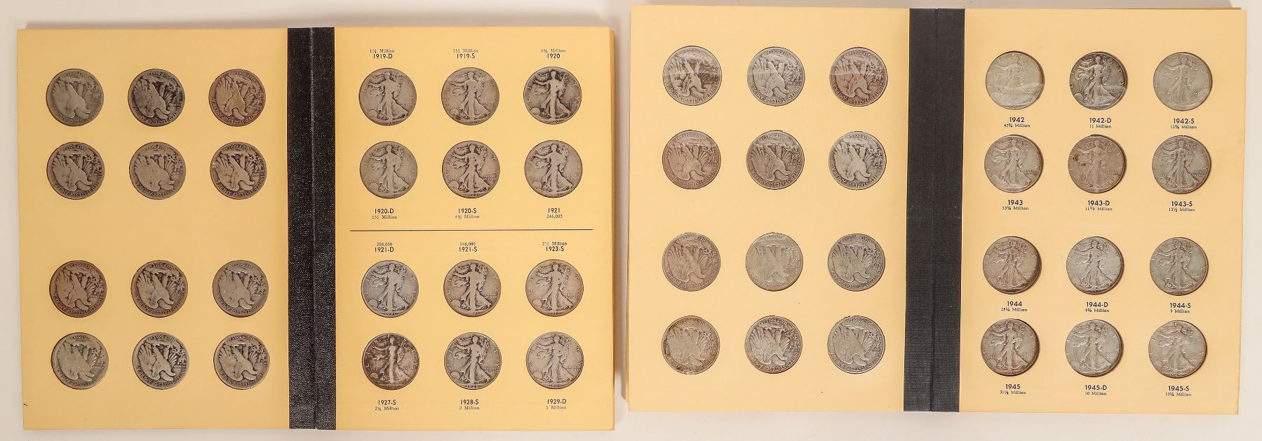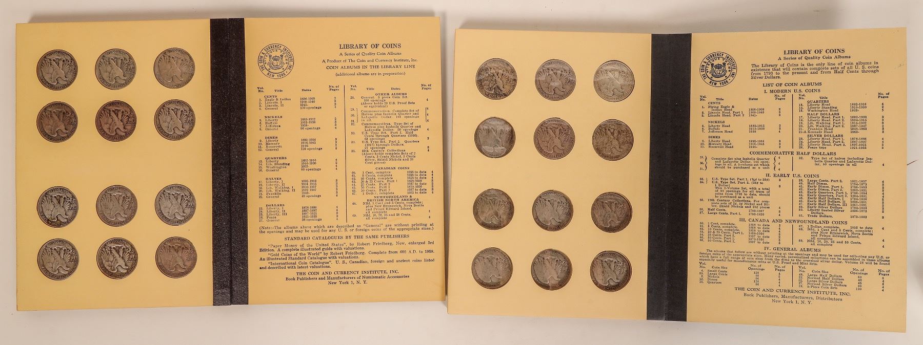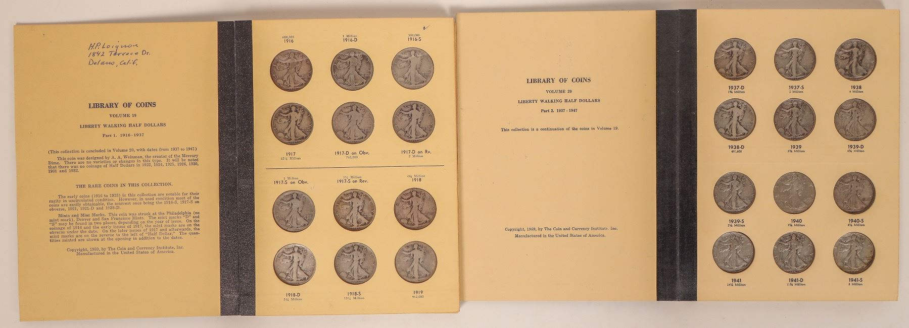 Two Library of Coins vintage coin albums, copyright 1959: Liberty Walking Half Dollars Part 1 1916-1937 Vol. 19 & Liberty Walking Half Dollars Part 2 1937 - 1947 Vol. 20. Total of 65 coins. Complete set including the 1916-S and 1921-D. Coins are nice condition, AG-EF condition.