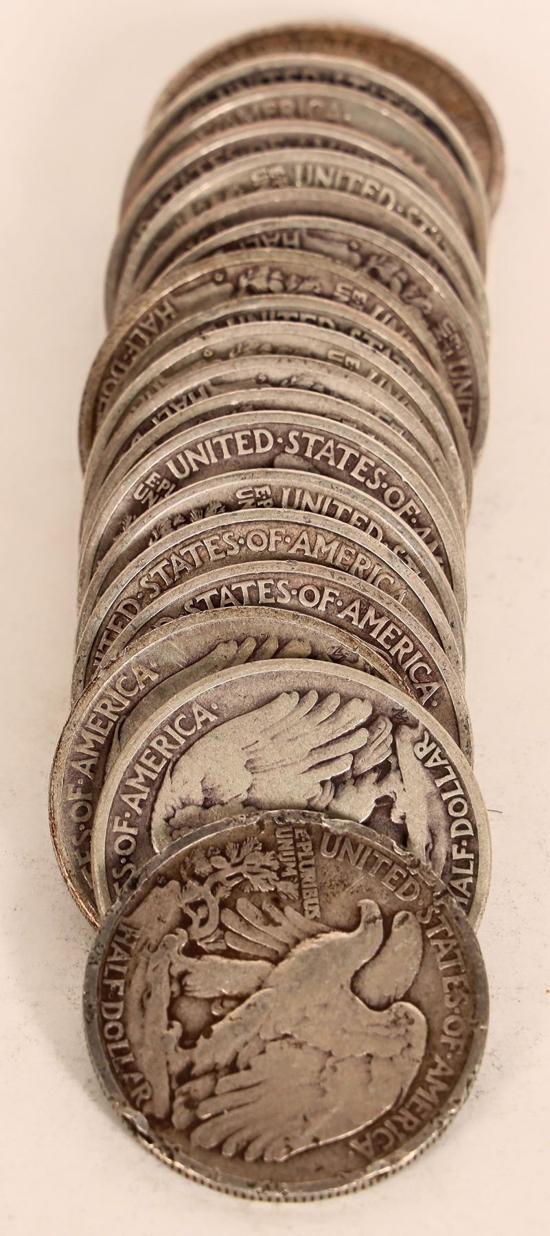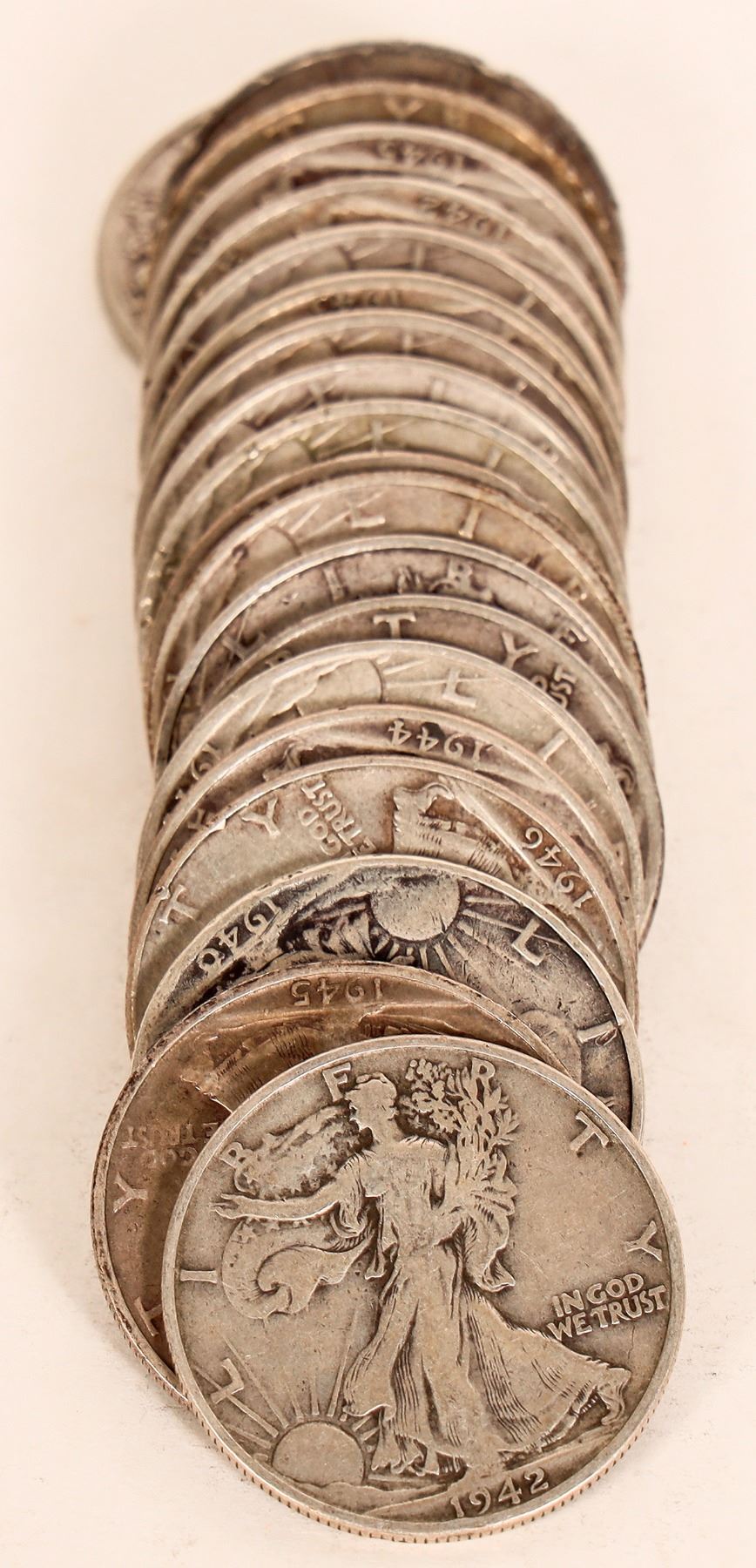 Roll of 20 Walking Liberty half dollars with 19 different dates and mint marks from 1940 through 1946. G-VF condition.