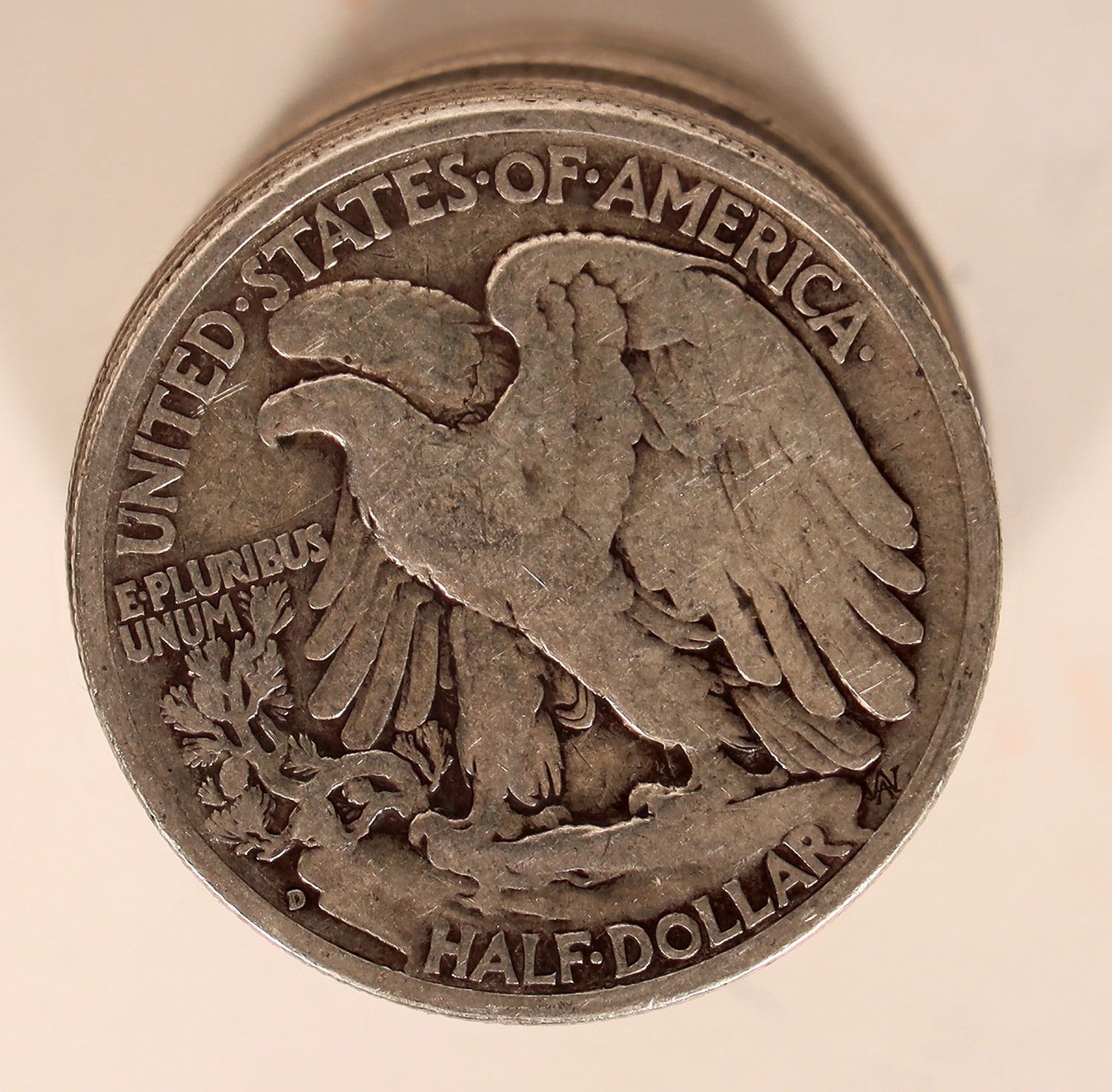 Denver mint during World War Two: one roll (20) Walking Liberty half dollars: four each: 1941-D; 1942-D; 1943-D; 1944-D; 1945-D. G-VF condition.