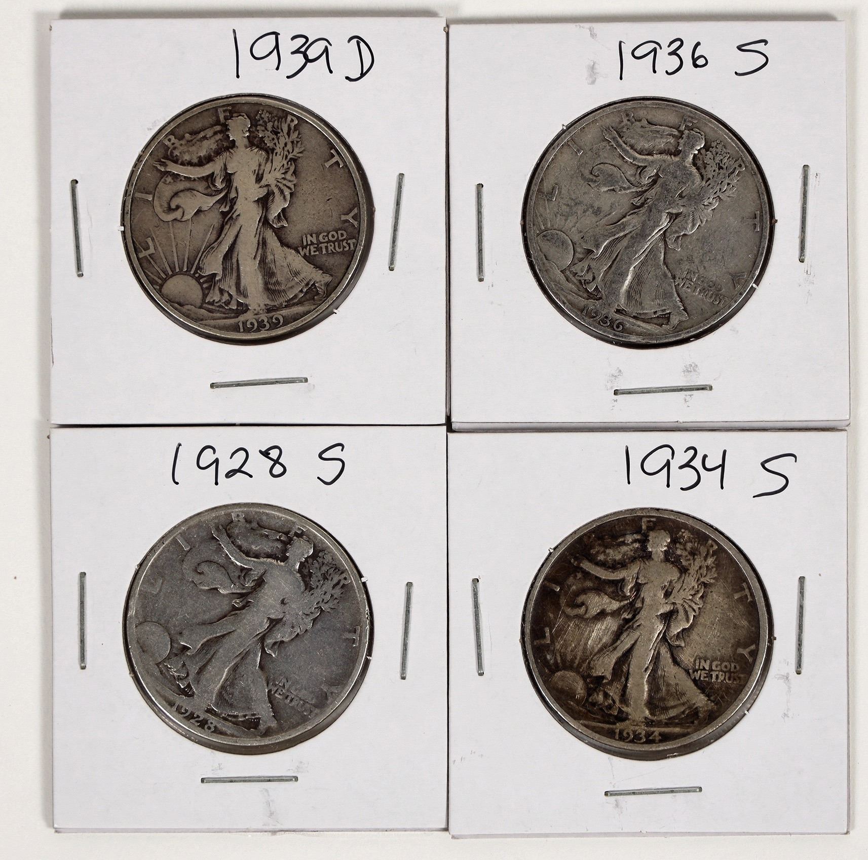 Four walking liberty half dollars: 1) 1928-S; AG-G; 2) 1934-S; G-VG; 3) 1936-S; G-VG; 4) 1939-D; G-VG.