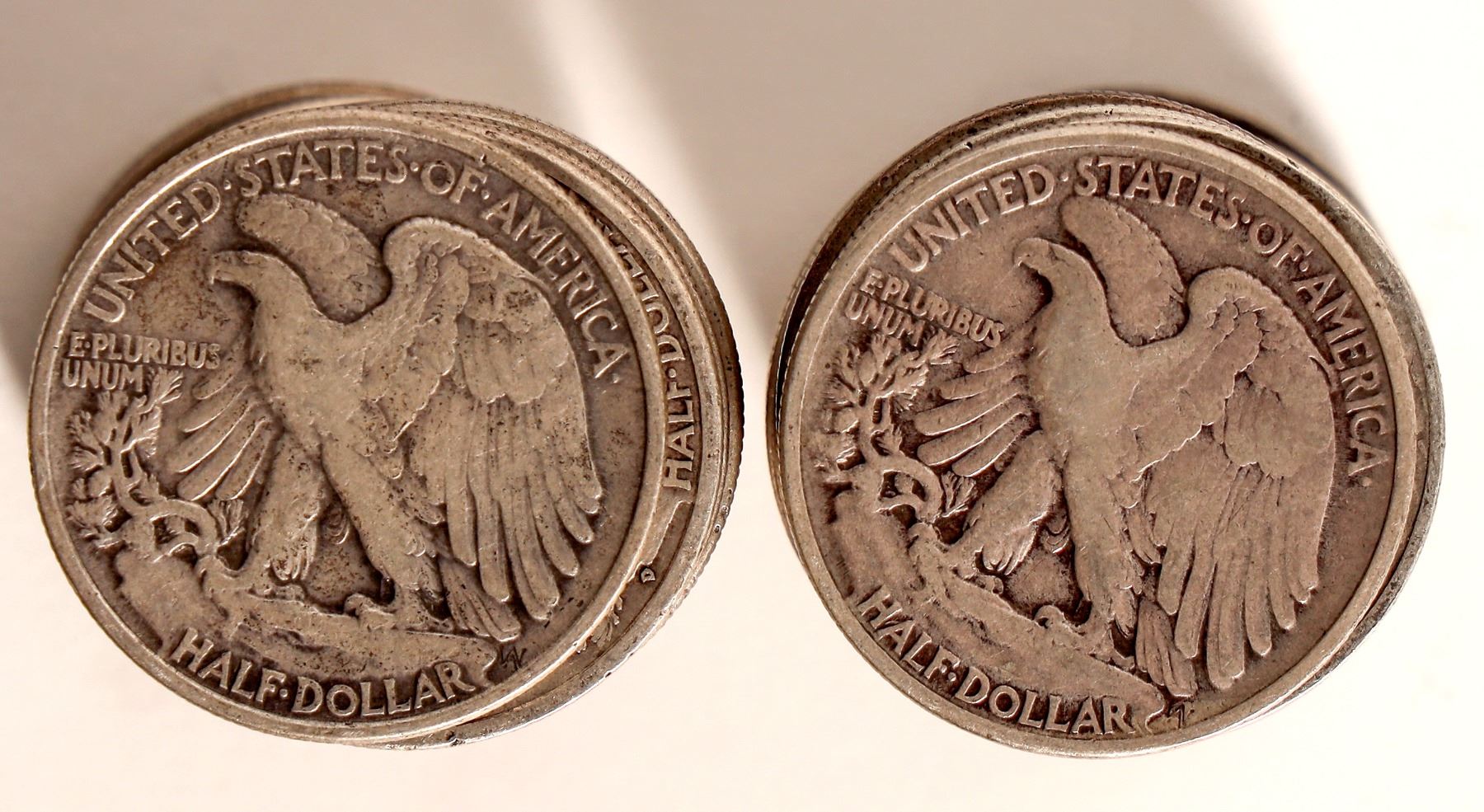 Two rolls (40 coins) of Walking Liberty half dollars dated 1939-1946. Mostly G-VF condition.
