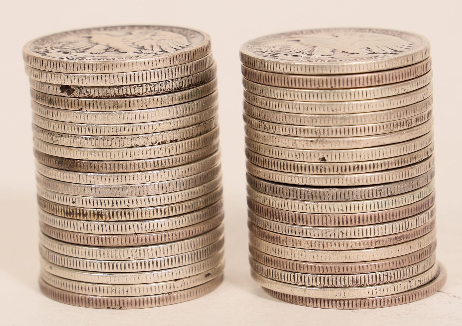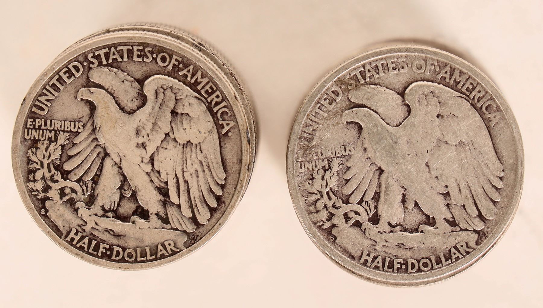 Two rolls average circulated Walking Liberty half dollars dated 1941-1945.