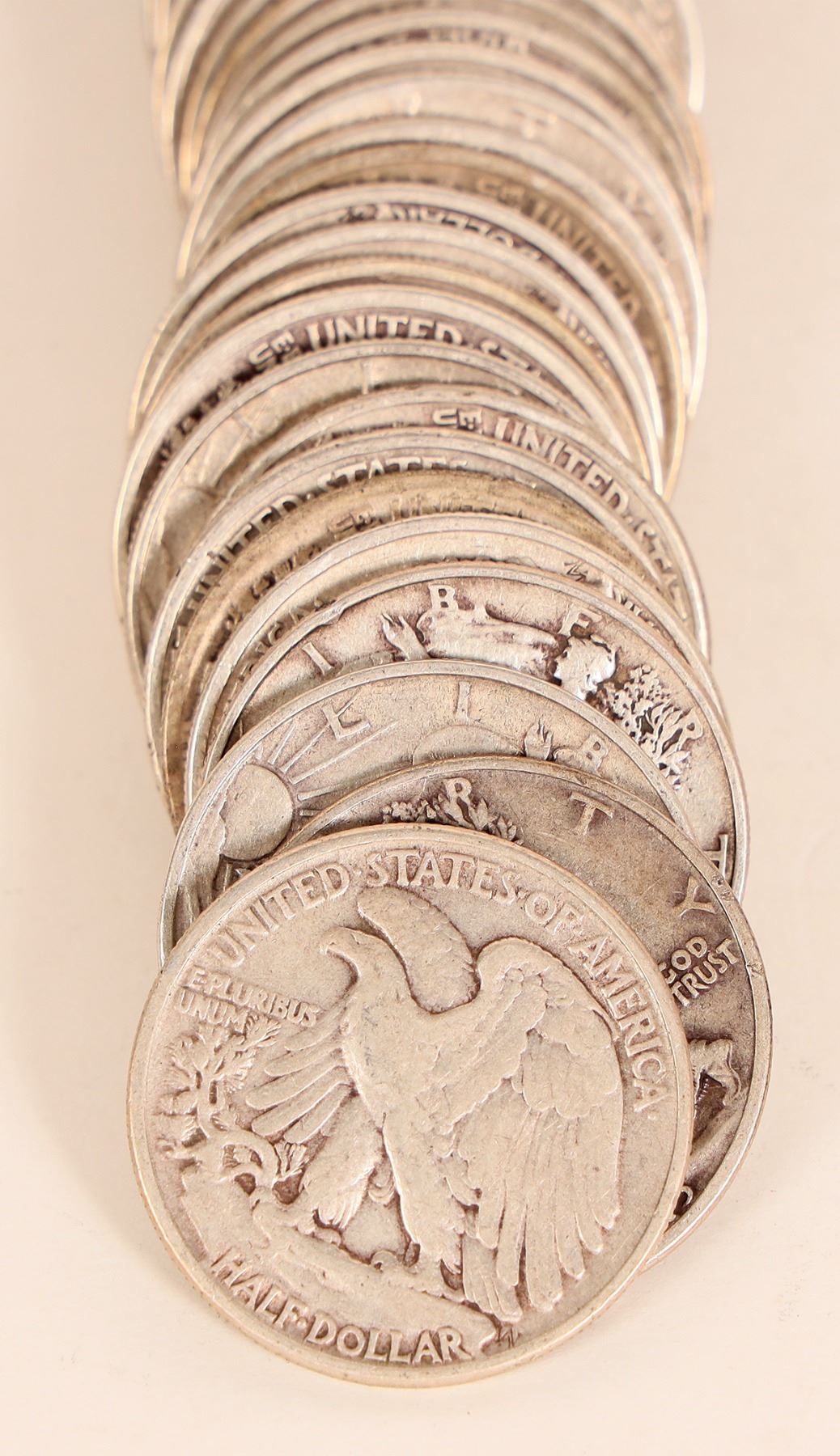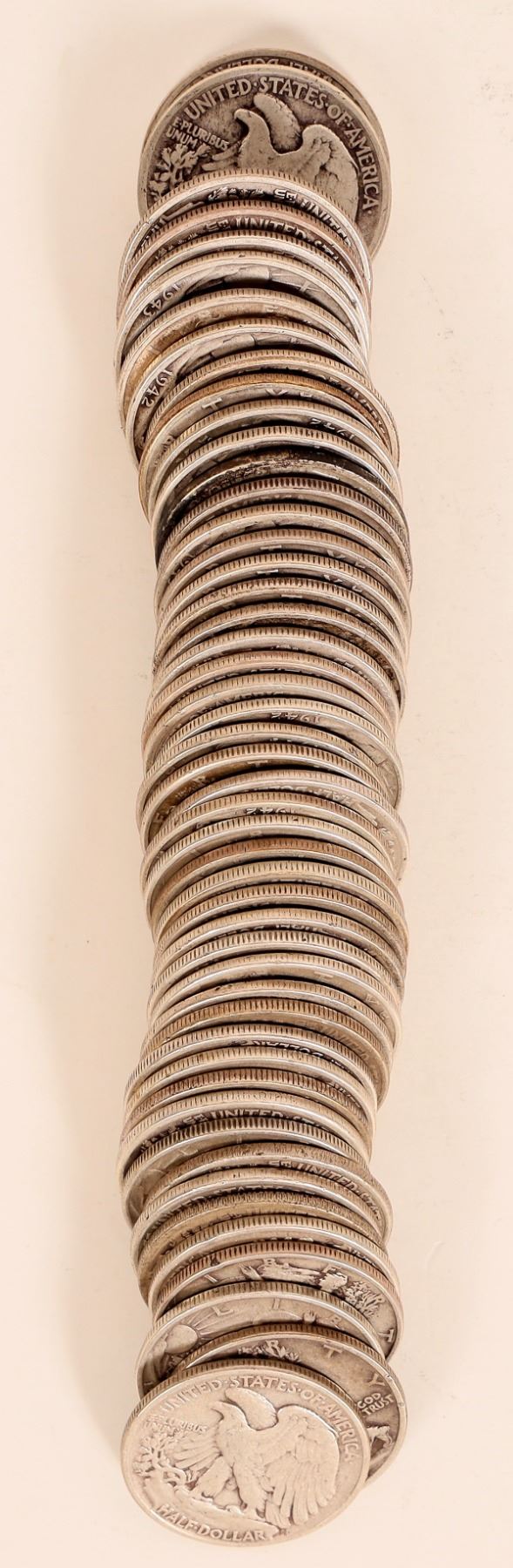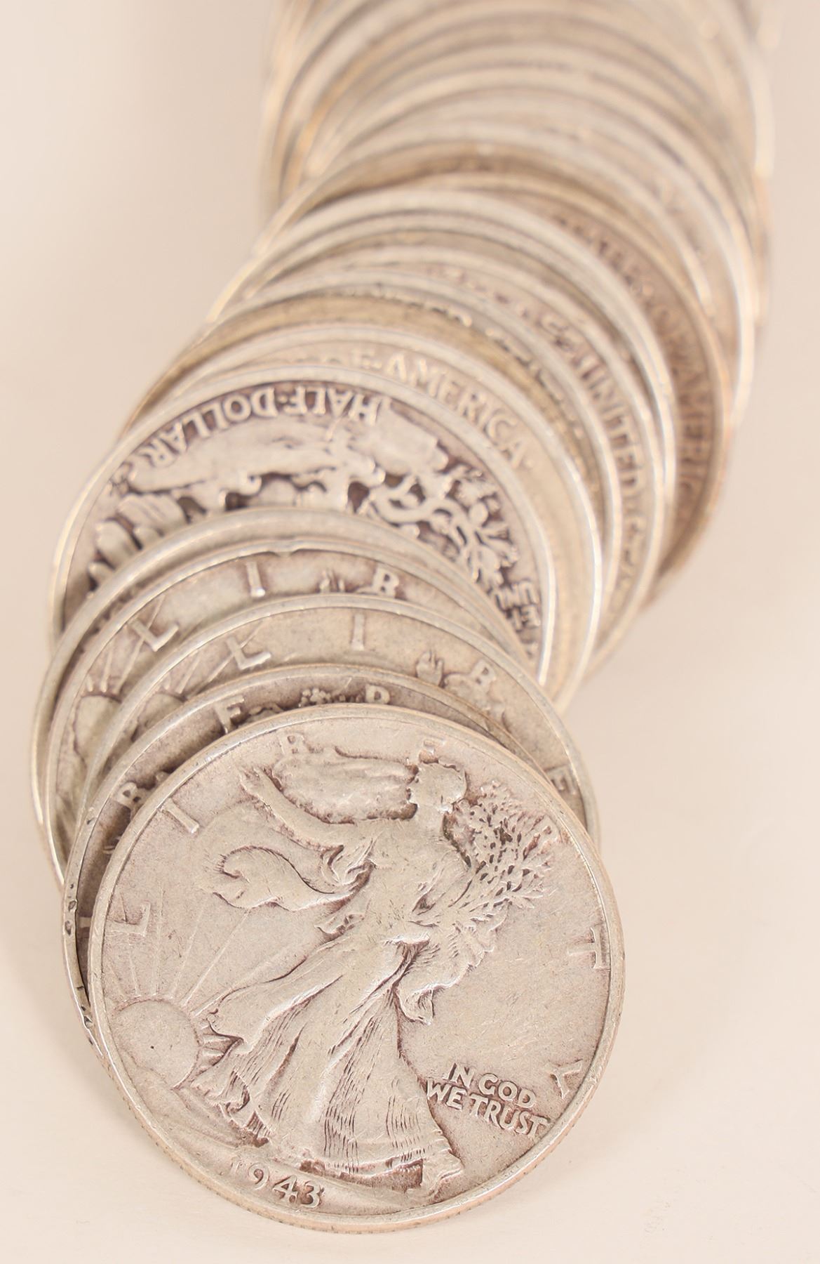 Walking Liberty half dollars (50) from the 1940s. AG-EF condition. $25 face value.