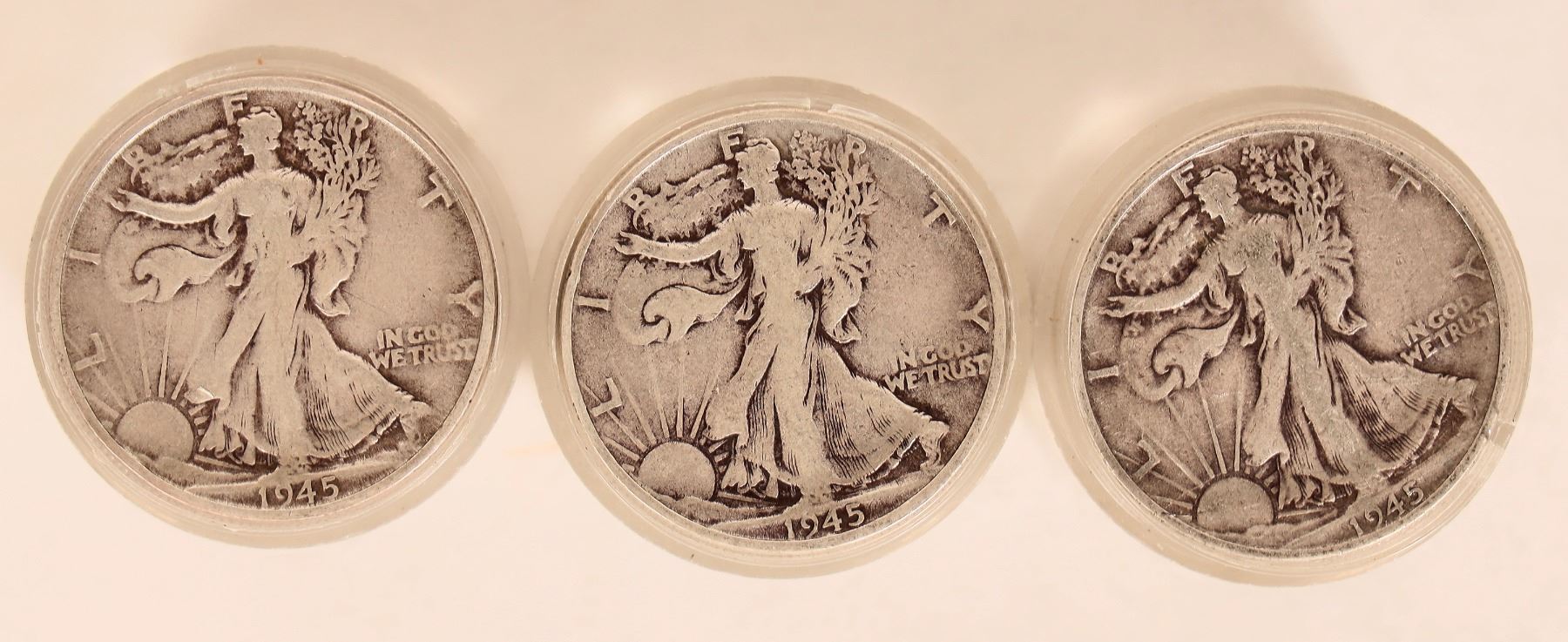 Three rolls (60 coins) Walking Liberty half dollars dated 1941-1945. Average circulation G-EF condition.