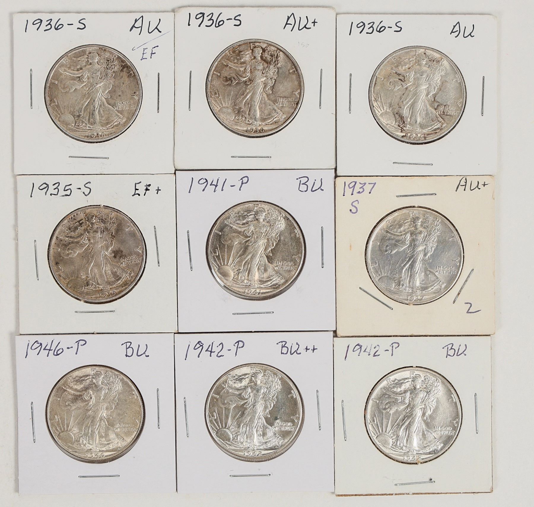 Nine Walking Liberty half dollars: 1935-S (EF); 1936-S (3: AU); 1937-S (AU); 1941 (BU); 1942 (2: BU); 1946 (BU).