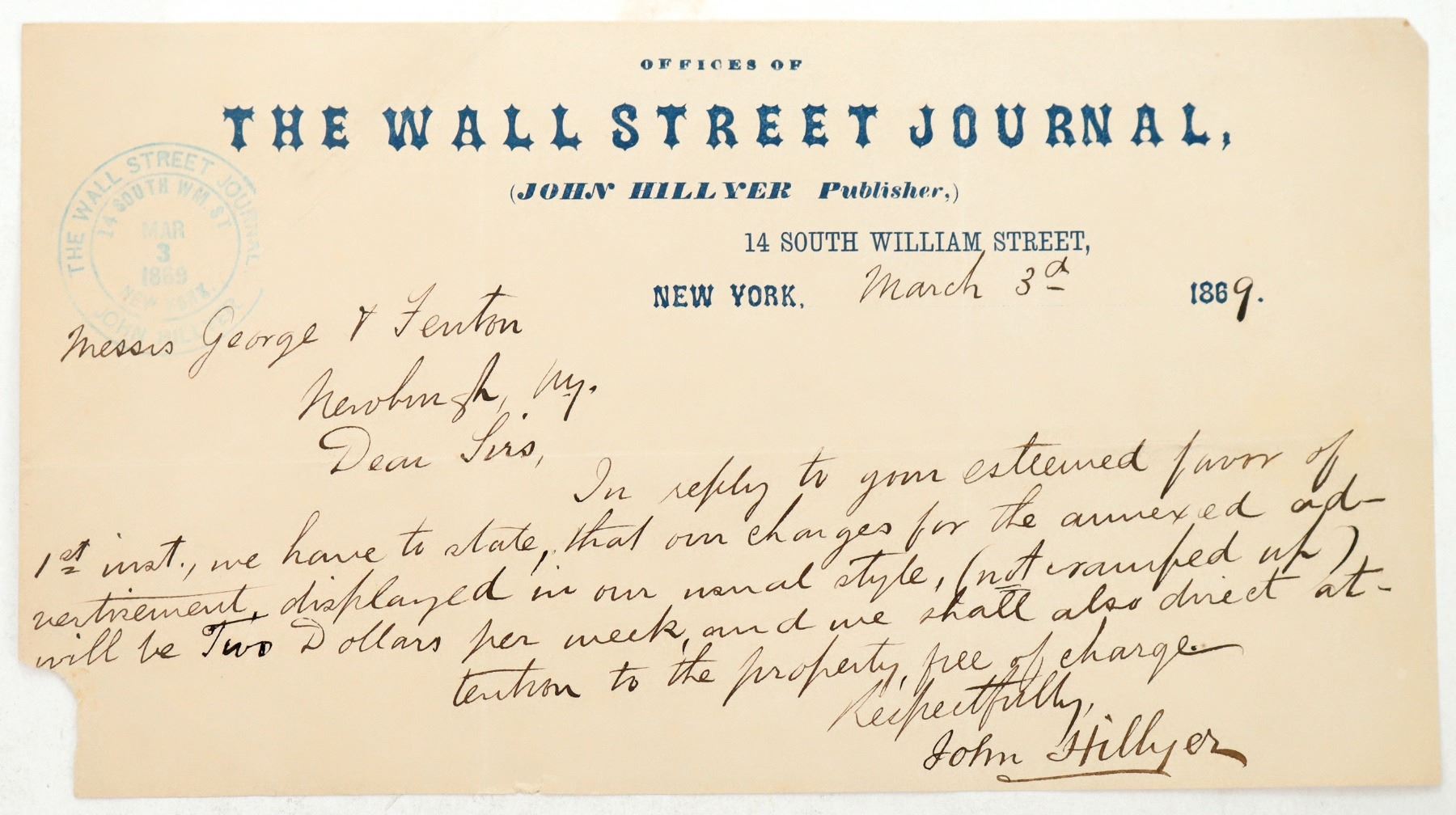 Handwritten note on the letterhead of John Hillyer, Publisher of The Wall Street Journal dated March 3rd, 1869 to George Fenton of Newburgh, New York. Signed Respectfully, John Hillyer and endorsed on reverse Jno. Hillyer / March 3rd, 1869. This Wall Street Journal was established March 1852 and located at 14 & 16 South William Street. Today's Wall Street Journal was founded in 1889 by Charles Dow and is owned by Rupert Murdoch's News Corporation.