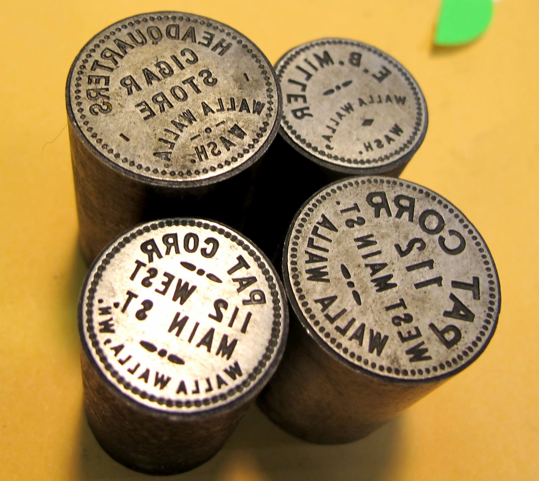 4 token dies self described from Walla Walla, WA. 21mm: EB Miller, Pat Corr. 24mm: Patt Corr, Headouartres Cigar Store. Northwest Territorial Mint Historical Die Collection