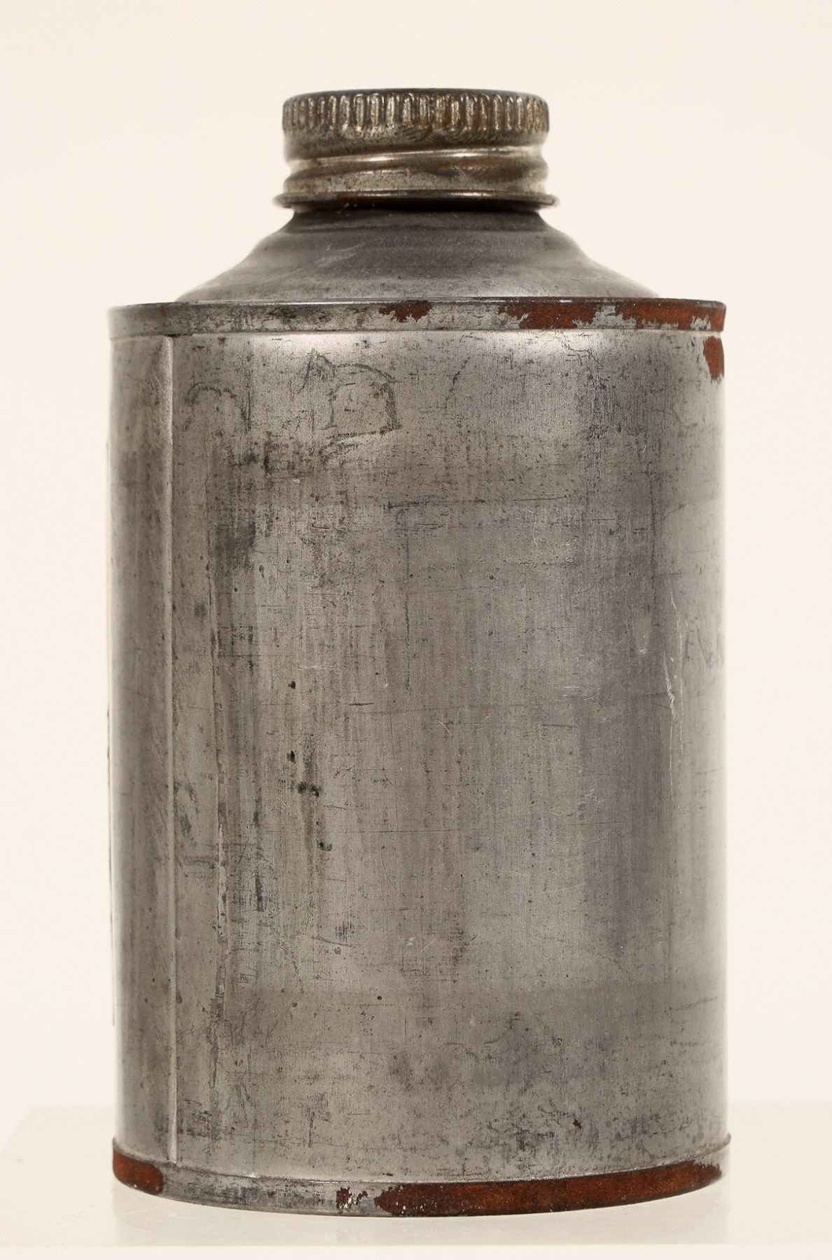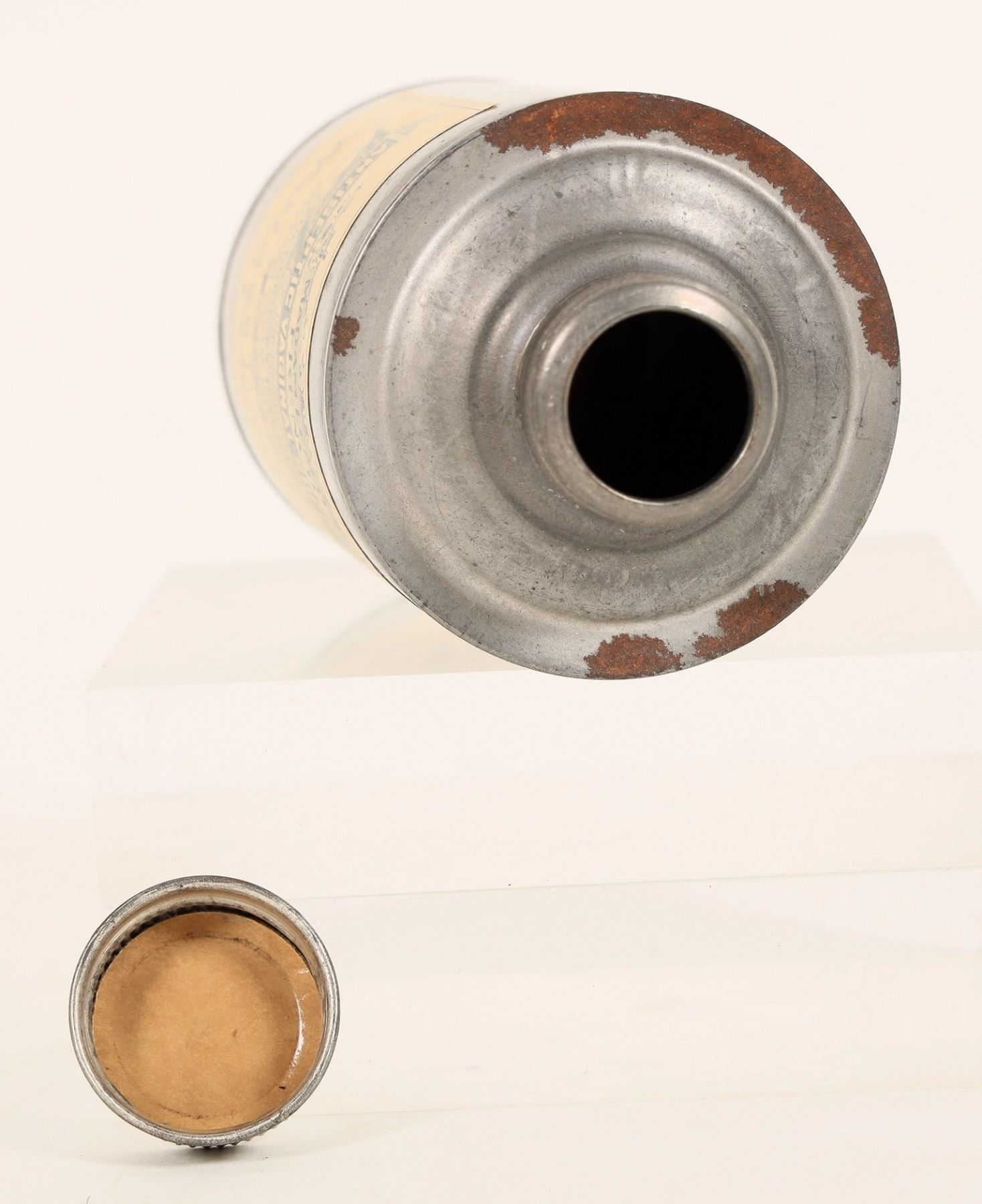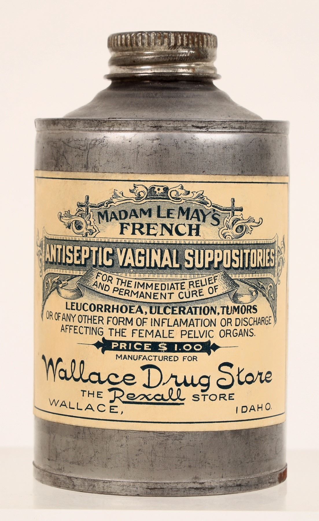 Antique tin medicine container from Wallace Rexall Drug Store in Wallace Idaho. Unique treatment, "Madam Lemay's French antiseptic usage for ladies. Price listed as $1.00. Slightly over 4" tall, 2 3/8" in diameter. Excellent condition, a few rust spots on top band. Screw top, lable in near-perfect condition. [