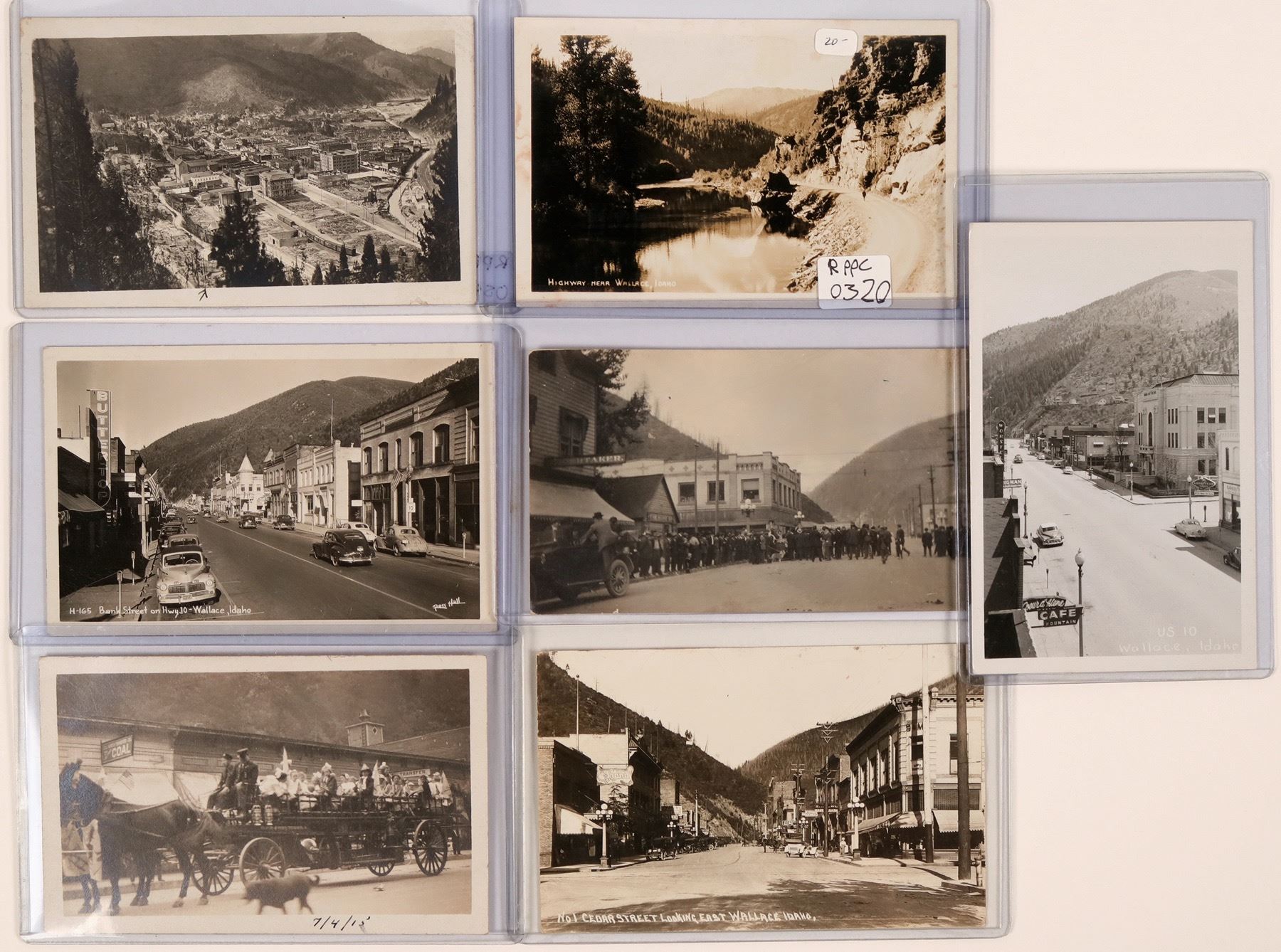 Lot of 7. Includes: A birds eye view of Wallace Idaho up against the mountains 1910 with a cancelled 1c stamp (1); A highway in the mountains near Wallace, Idaho(1); Cedar Street looking East, Wallace, Idaho (1); Street scenes, one which depicts Bank Street on Hwy 10 (2); 1915 Possibly a parade and photo of the Chicago/Seattle Auto Relay (2).