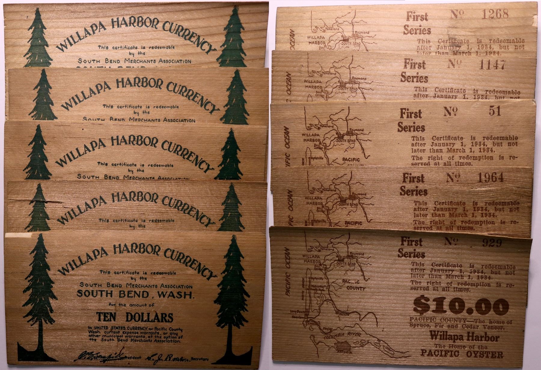 This is a cache of five Wallapa Harbor Currency in cedar veneer. Each bill is 2 3/4 in. X 5 in. on a veneer platform ranging from .25 ct. to $10.00. C. 1934.