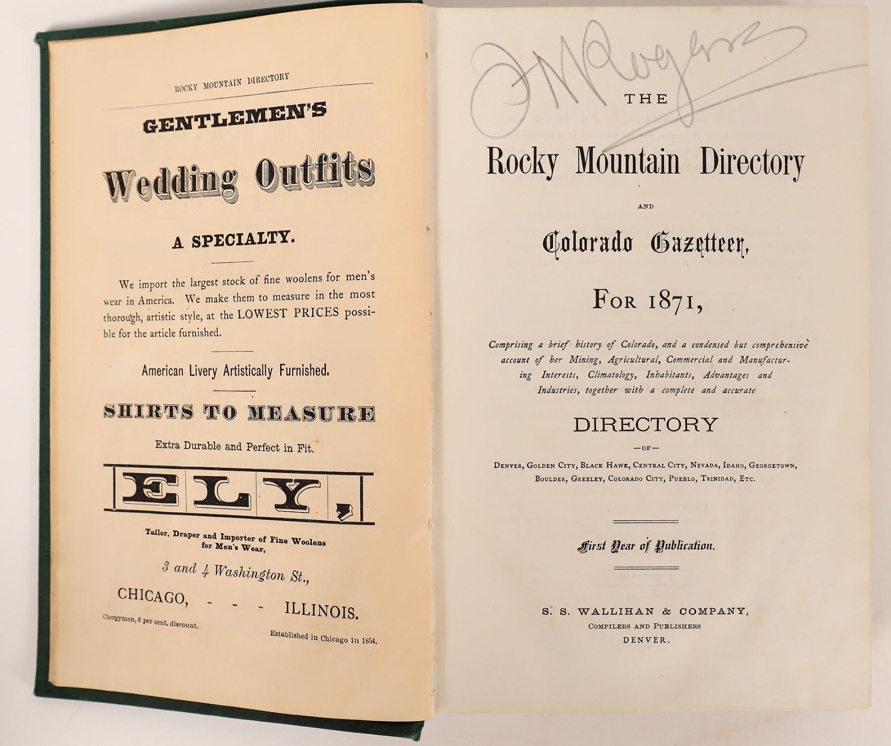 THE ROCKY MOUNTAIN DIRECTORY AND COLORADO GAZETTEER, FOR 1871. Denver: S.S. Wallihan & Co., [1870]. [7]pp. of ads, 442pp. plus [59]pp. of ads, and [144]pp. of ads interspersed in the text. Original gilt cloth. Head and toe of spine frayed and bit chipped. Somewhat sunned, especially the spine. Contents a bit shaken. Internally very good. This directory, here in its first year of publication, is an extremely detailed compendium of information and statistics on virtually every aspect of the territory, covering its history, geography and geology, natural resources, etc. “This Directory gives useful information on the early territorial history of Colorado, including the various conventions and forms of government in the early days, railroads, colonization, and early mining” – Streeter. The sections on mining, pp. 151-247 is quite detailed with a description of the mines in Gilpin, Clear Creek, Boulder, Summit and Lake counties, all arranged alphabetically. A section on the Character, Treatment and value of Ores is quite detailed and includes a description of the stamp mills in Gilpin County. The volume also includes an accurate directory as well as History for Denver, Golden City, Black Hawk, Central City, Nevada, Idaho, Georgetown, Boulder, Greeley, Colorado City, Pueblo, Trinidad, etc. A more useful and comprehensive guide to pre-statehood Colorado would be difficult to find. Not in Eberstadt, Graff, or Decker. Howell bought the Streeter copy for $110. HOWES C611. STREETER SALE 4280