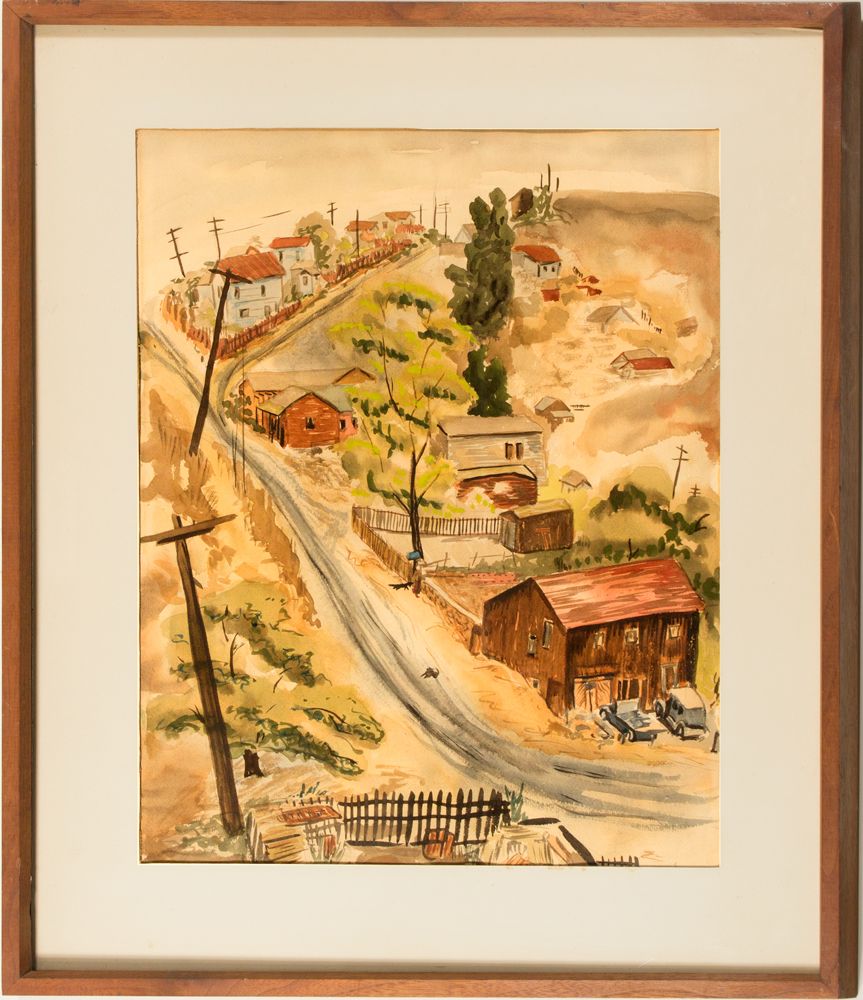 Watercolor by unknown California artist of a road winding up a hill with houses along the way. Painting removed from original mat and frame to check for artist's signature (none found). Returned piece to original mat and frame—24.75" H x 20.75" W. Burger Collection