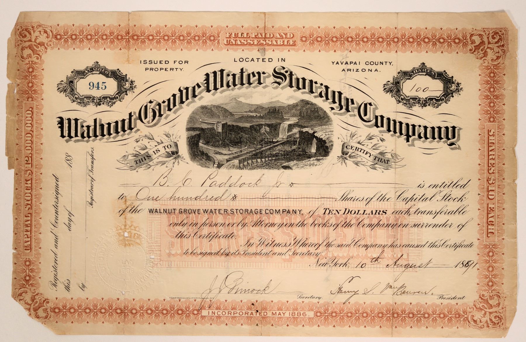Inc. in 1886. Located in Yavapai County, Arizona (printed at top right). No. 945, issued for 100 shares to BC Paddock Jr. in 1891. Signed by company president Henry Van Beuren and the secretary. Not cancelled. Brown border, black print, and hydraulic mining vignette. Poor condition: old tape repairs, very rough edges and toning/soiling. 7.75 x 12" According to United States Investor, Volume 13, Issue 27, the company built two dams that were washed out in the 1890s. Governor Brodie is now in charge. The company has a lot of property. City: Yavapai County State: Arizona Date: 1891
