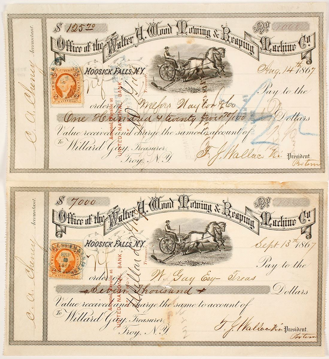 Two pictorial drafts from this farming equipment company based in Hoosick Falls, New York. Both are issued in 1867, Each has a 2 cent IR adhesive stamp with a tied cancel. Vignette of man using a horse-drawn farm mowing & reaping machine. 4.5 x 8.25" Date: 1867 Location: Hoosick Falls, New York HWAC# 60437