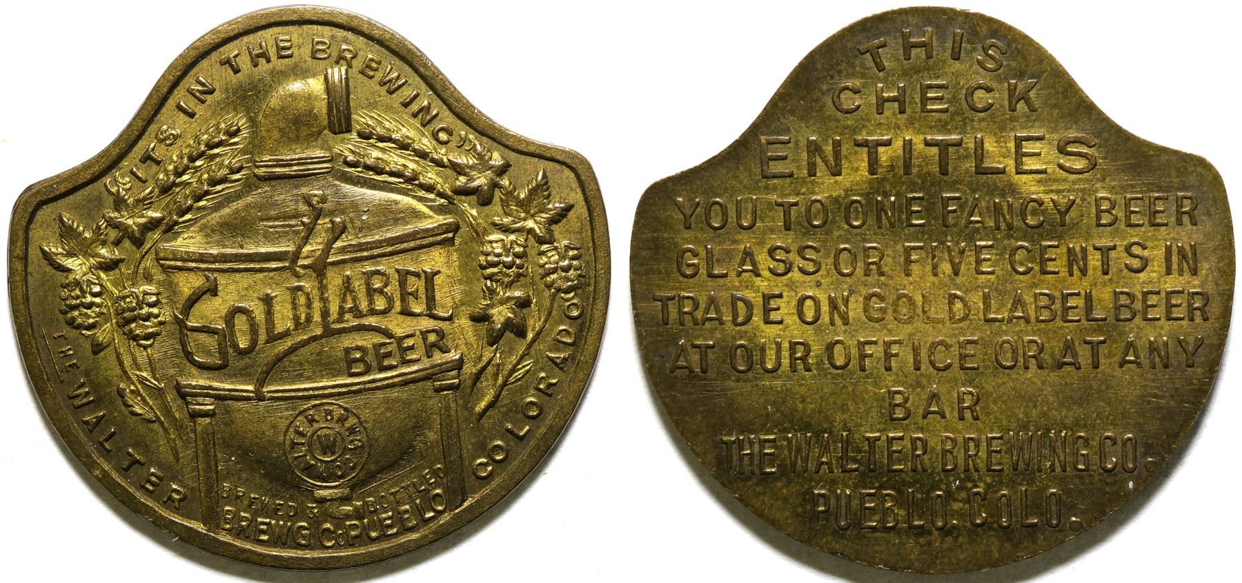 Walter Brewing Company Token from Pueblo, Colorado. Design reads "IT'S IN THE BREWING" / GOLD LABEL / BEER / THE WALTER BREWG CO PUEBLO COLORADO Good for 5c. 2 reported. City: Pueblo State: Colorado Date: